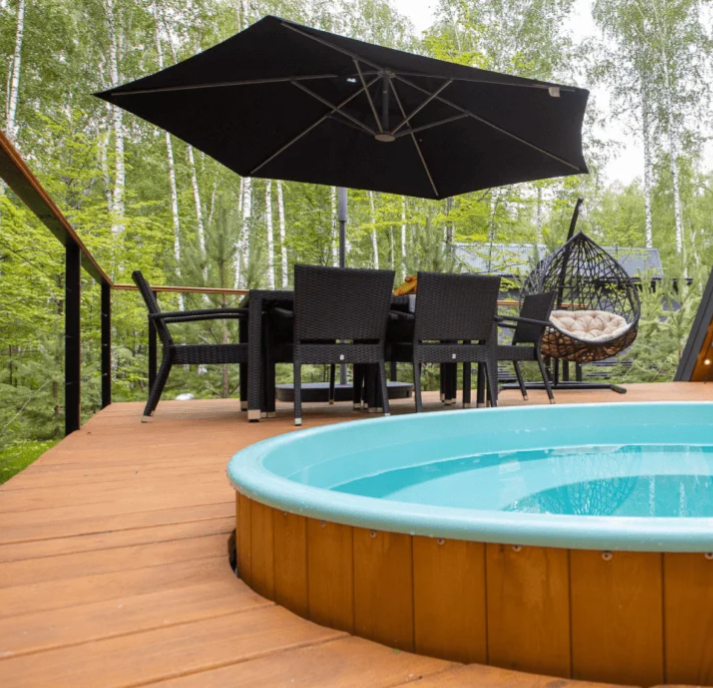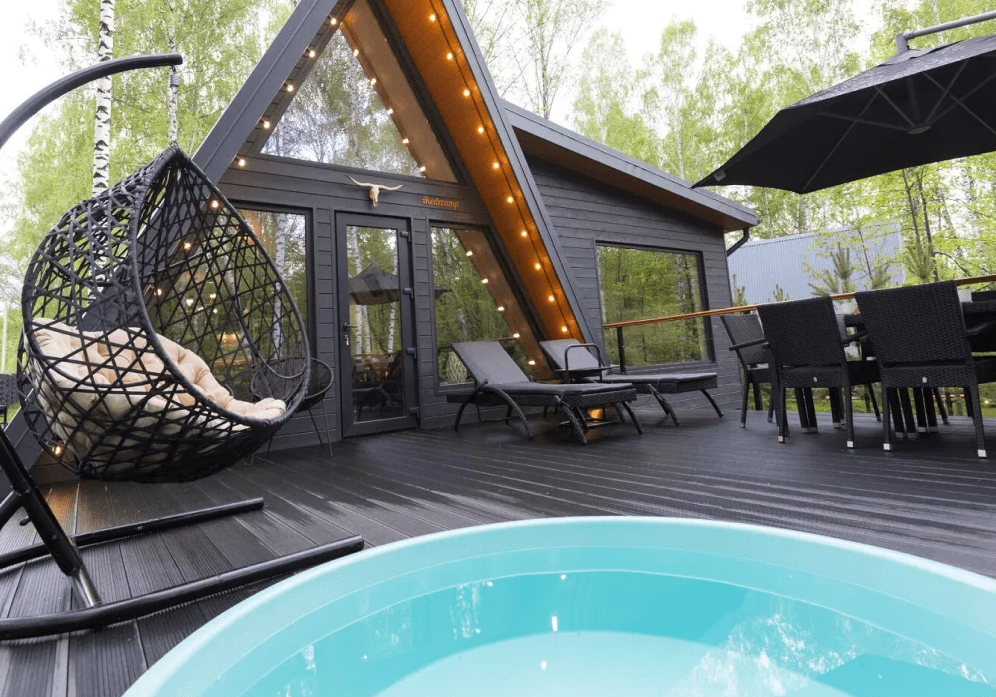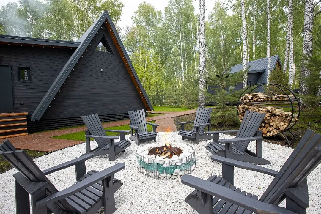 У каждого дома есть свое приватное место для отдыха на свежем воздухе: большое костровище с удобными деревянными креслами и зона барбекю.