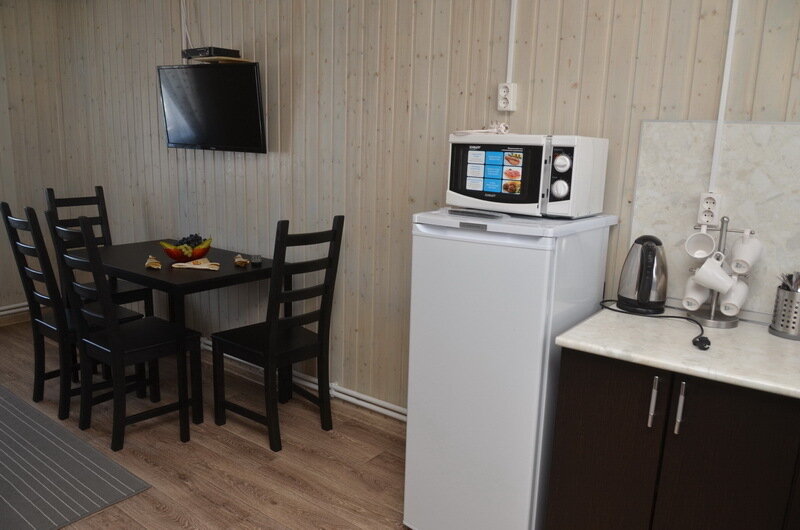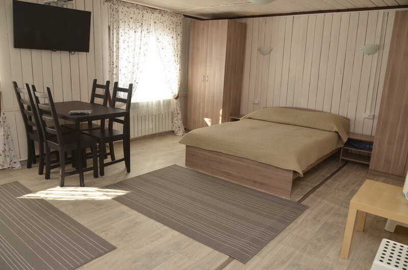 Две спальни (в одной 2 односп. кровати, во второй - 3 односп. кровати), гостиная с кухонной зоной, диван раскладной, СВЧ, ТВ, с/у с душем