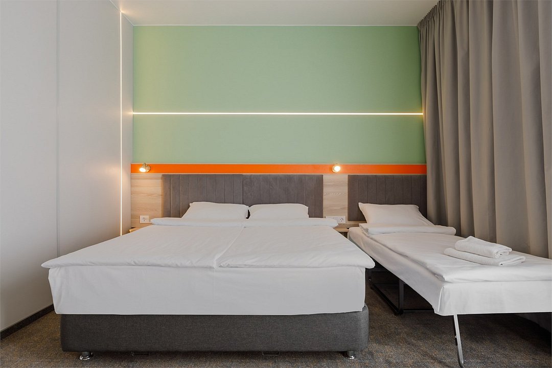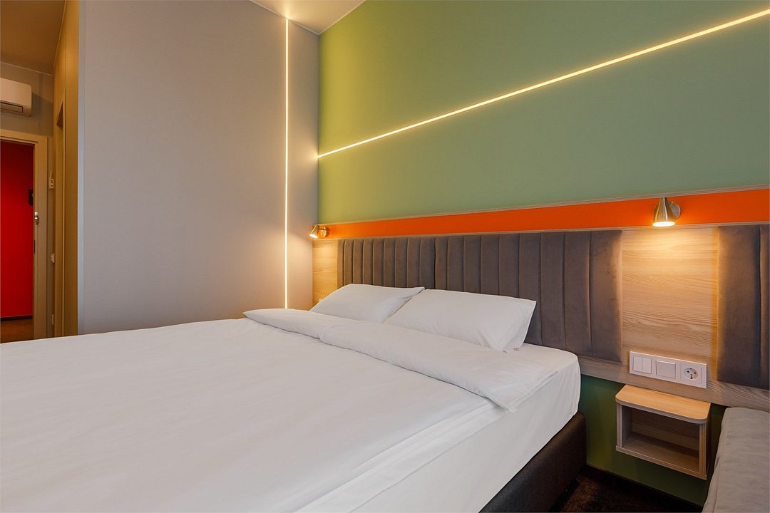 Номер площадью 18 м2 с 2 односпальными кроватями с анатомическим матрасом рассчитан на 2 взрослых и 1 ребенка. Для детей до 5 лет включительно проживание в одном номере со взрослыми предоставляется бесплатно на отдельном спальном месте. По запросу может быть предоставлена детская кроватка (для детей от 0 до 3 лет). В номере: Кровати с ортопедическими матрасами, телевизор, мини-бар, кондиционер, телефон. В собственной ванной комнате есть все необходимое для путешественников: набор полотенец, туалетно-косметические принадлежности, фен, тапочки. Для комфортного отдыха в номерах используются светонепроницаемые шторы и улучшенная звукоизоляция. Доступ к высокоскоростному интернету и рабочий уголок позволяют оперативно и комфортно решать рабочие вопросы. Размещение с домашними животными возможно за дополнительную плату только по предварительному согласованию с отелем. Собаки весом до 5 кг, кошки. Не более 1 питомца в номере. Стоимость размещения домашних животных - 1000 руб в сутки, депозит - 5000 руб.Услуги и удобства