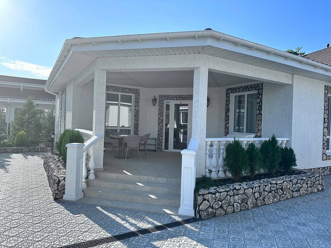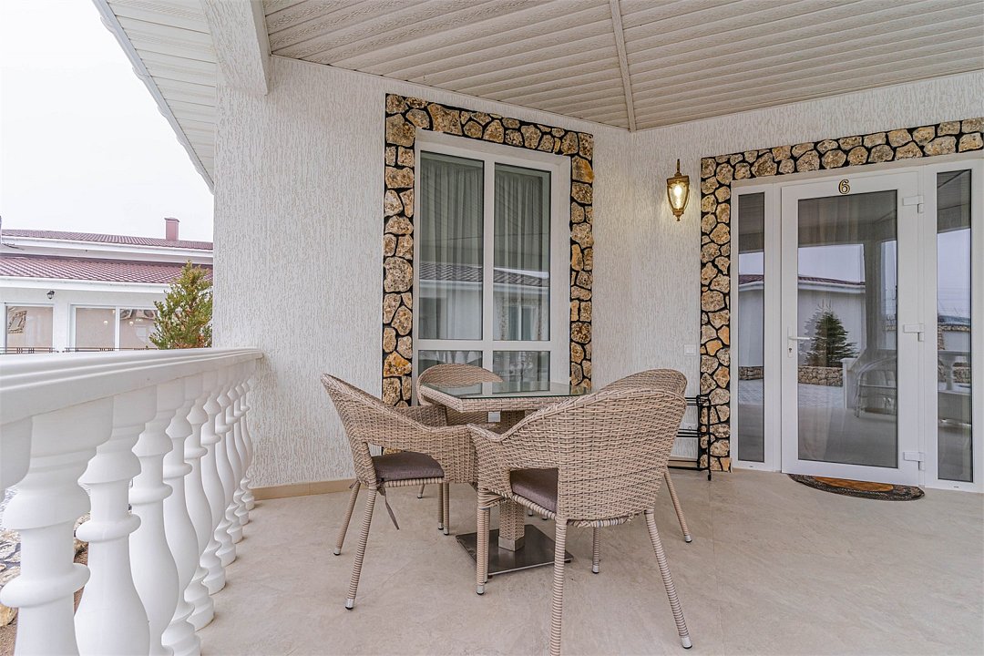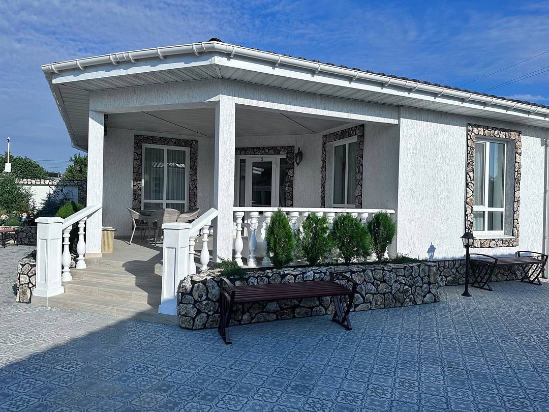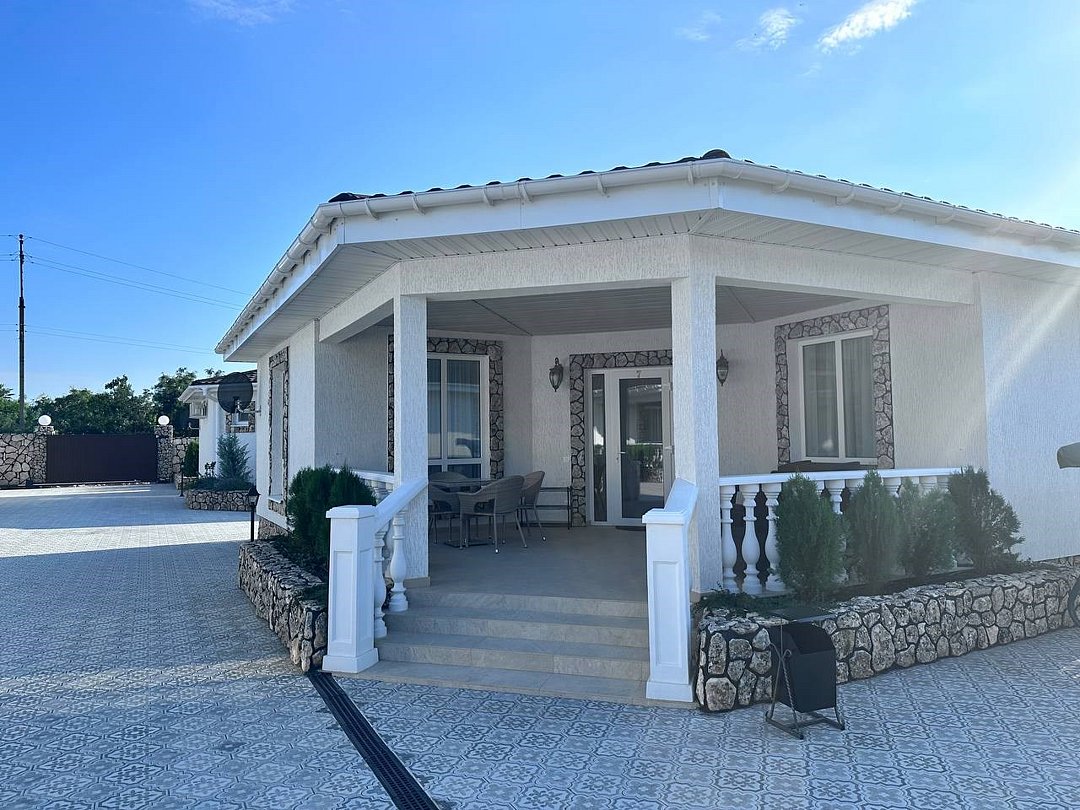О гостевых домах Наши гостевые дома расположены на Крымском полуострове, который омывается водами Черного моря. Возле территории дома есть много развлечений, живописных мест, где вы хорошо проведете время с семьей или друзьями. Домик: две спальни , гостиная комната, санузел, гардеробная, терраса . Wi-Fi Кондиционер Фен Электрический чайник Набор столовых приборов Чайный набор Штопор Бокалы для вина В спальне одноместные кровати , по запросу можно сдвинуть . Комоды для одежды , тумбочки , светильники . В гостиной двухместный диван (доп. место) , обеденный стол, телевизор. Терраса: плетеная мебель и стол.Услуги и удобства