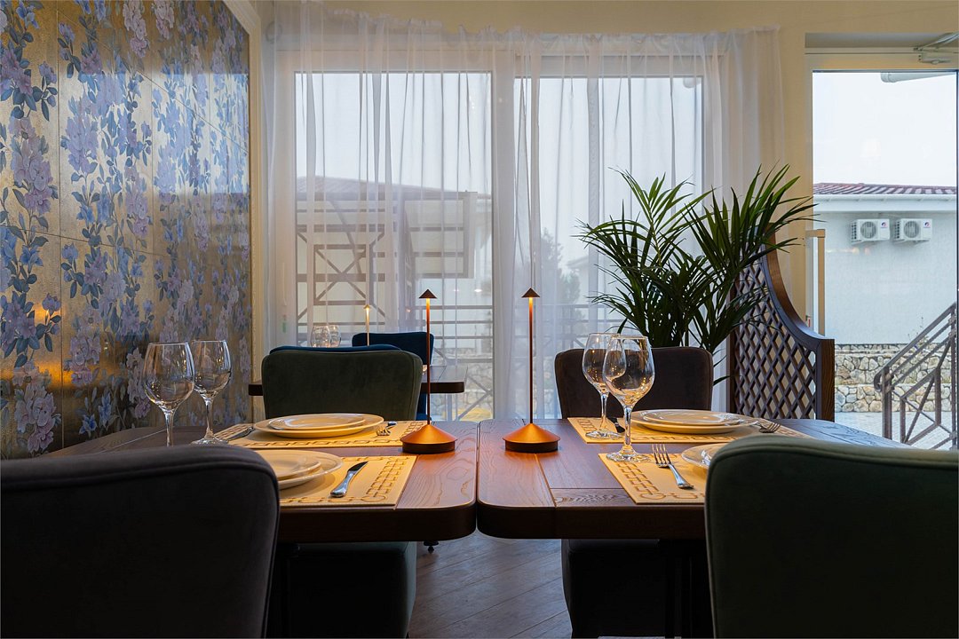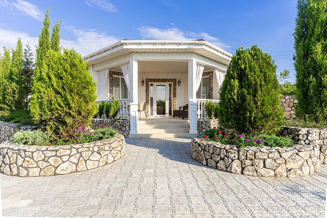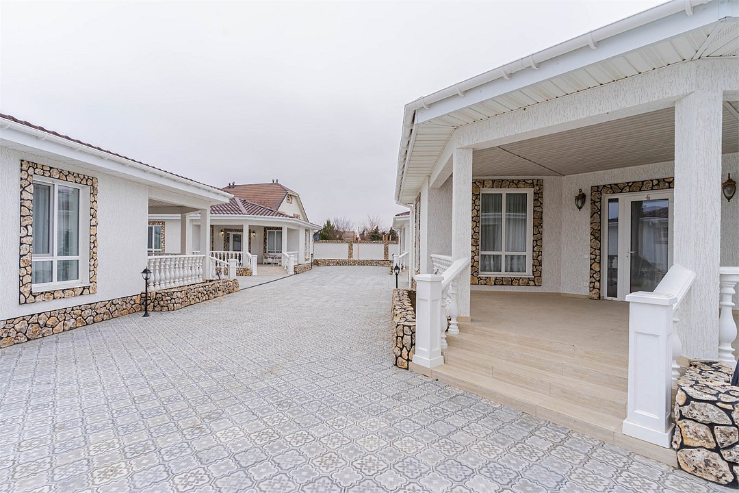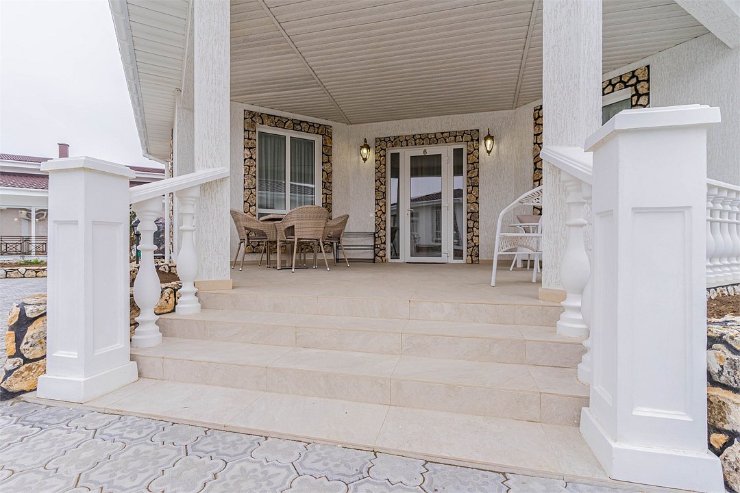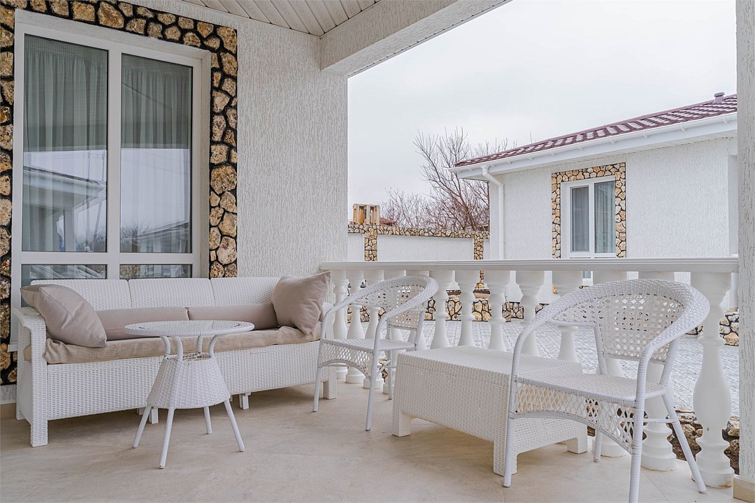 О гостевых домах Наши гостевые дома расположены на Крымском полуострове, который омывается водами Черного моря. Возле территории дома есть много развлечений, живописных мест, где вы хорошо проведете время с семьей или друзьями. Домик: две спальни , гостиная комната, санузел, гардеробная, терраса . Wi-Fi Кондиционер Фен Электрический чайник Набор столовых приборов Чайный набор Штопор Бокалы для вина В спальне одноместные кровати , по запросу можно сдвинуть . Комоды для одежды , тумбочки , светильники . В гостиной двухместный диван (доп. место) , обеденный стол, телевизор. Терраса: плетеная мебель и стол.Услуги и удобства