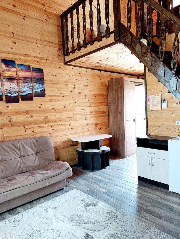 Представляем вашему вниманию уютный двухуровневый номер, выполненный в стиле шале. Этот номер идеально подойдет для тех, кто хочет окунуться в атмосферу загородного дома и насладиться комфортом и уютом. На первом уровне номера располагается просторная гостиная, оформленная в светлых тонах. Деревянные панели на стенах и потолке создают ощущение тепла и комфорта. В гостиной находится мягкий диван, на котором можно удобно расположиться после насыщенного дня. Также есть обеденный стол на четыре персоны, холодильник, чайник, набор посуды. Рядом с гостиной находится ванная комната, оснащенная душем, туалетом и раковиной. На втором уровне номера находится спальня с большой кроватью, которая обеспечит вам комфортный сон. В номере есть все необходимое для комфортного проживания: телевизор, Wi-Fi, кондиционер. У каждого номера свой отдельный вход с террасой, которая укомплектована уличной мебелью. Этот двухуровневый номер прекрасно подойдет для семейного отдыха или романтического уикенда.Услуги и удобства