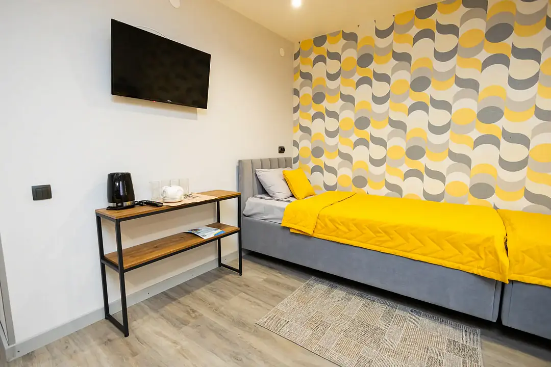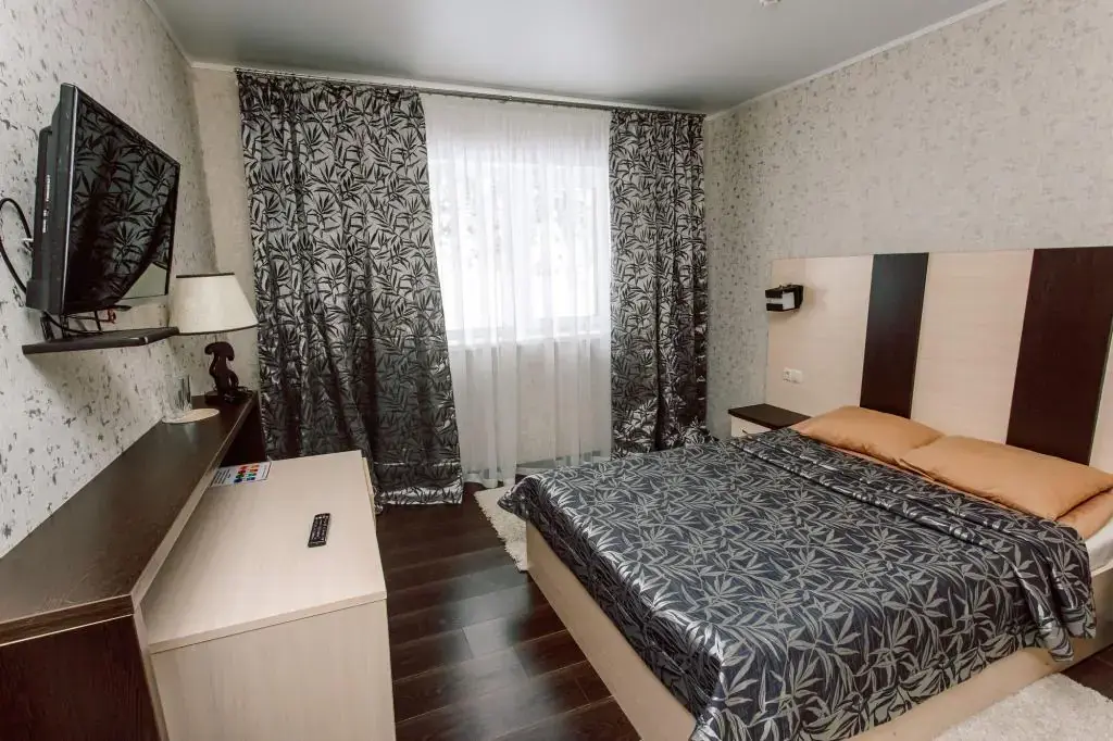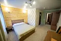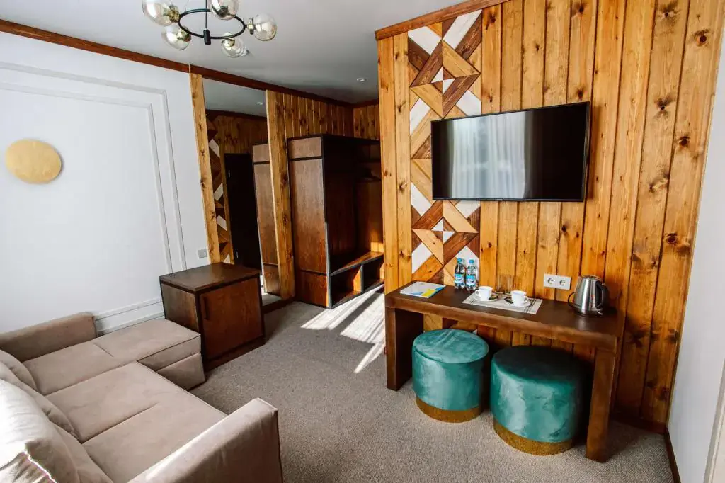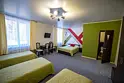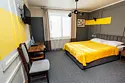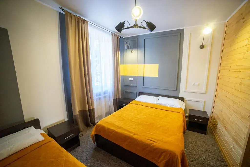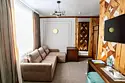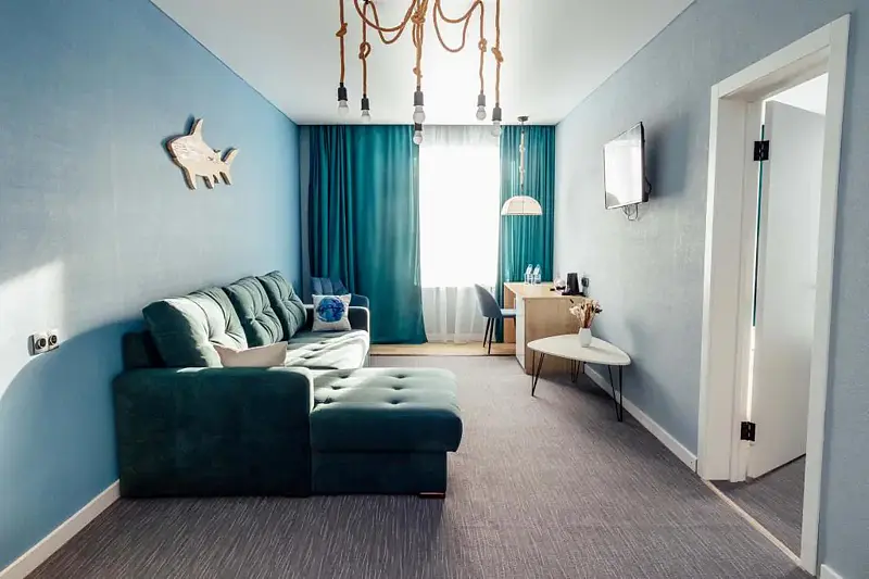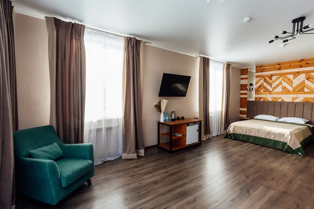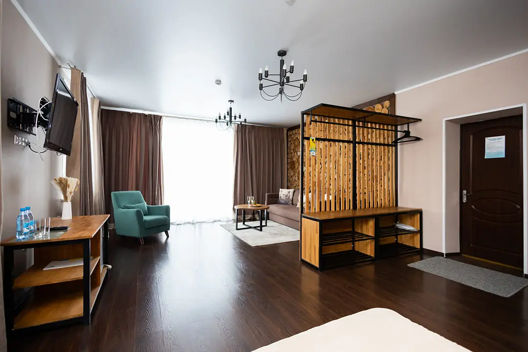 Двухместные номера в гостинице «SkyDream» расположены на втором этаже здания. Оснащены двуспальными кроватями, прикроватными тумбами, двумя креслами, столом, стульями, телевизором, диваном, прихожей.