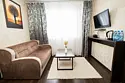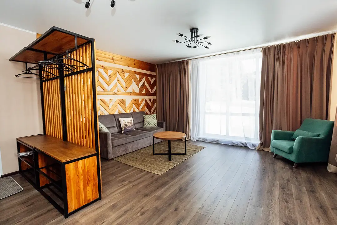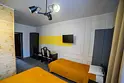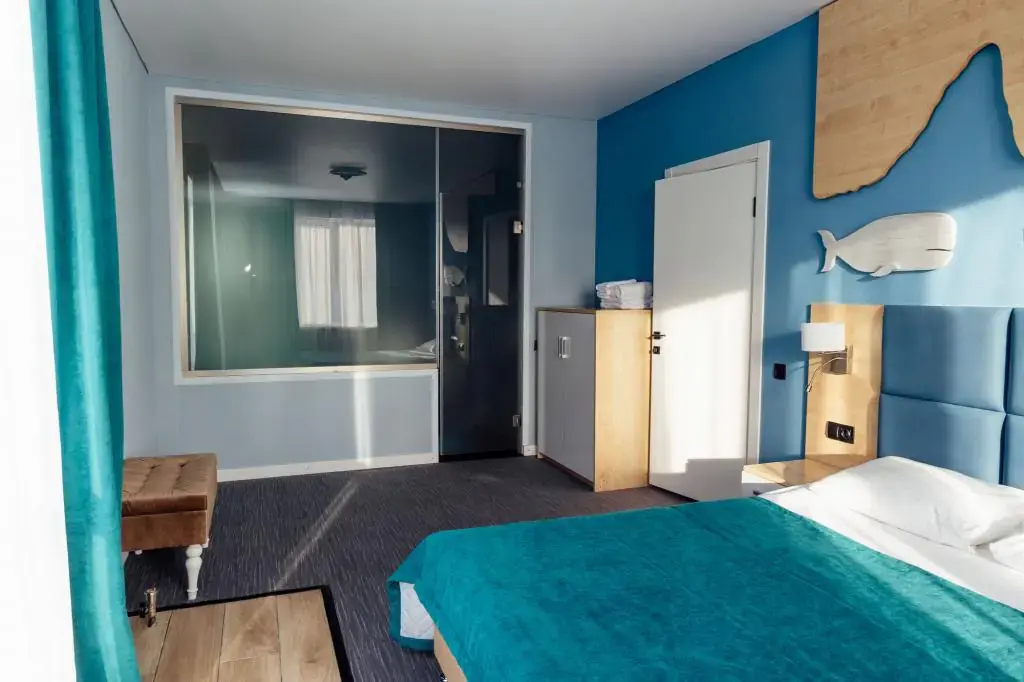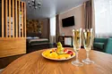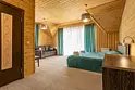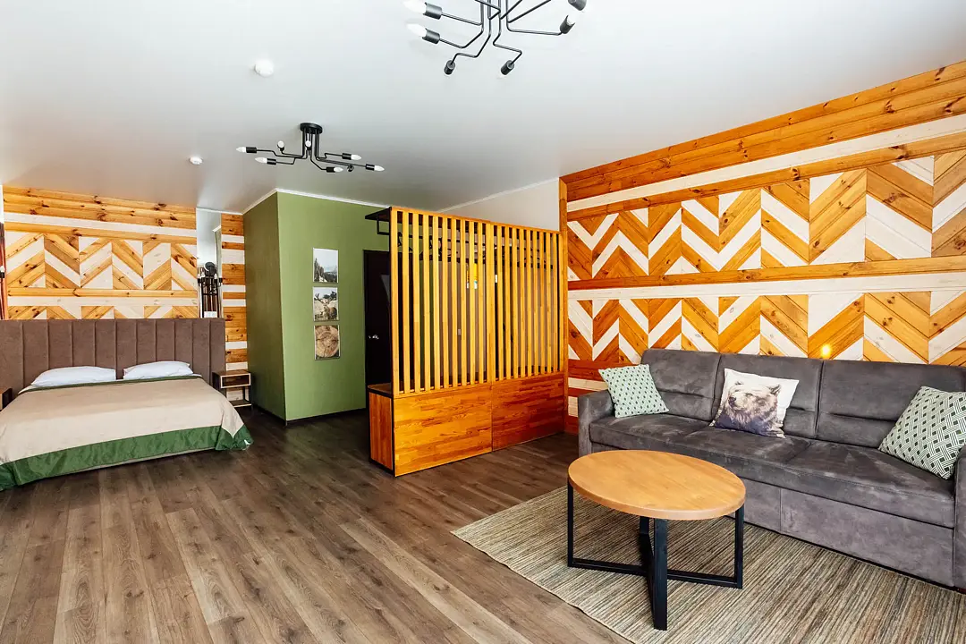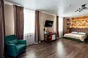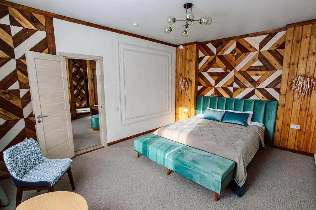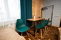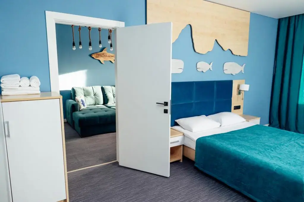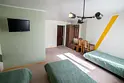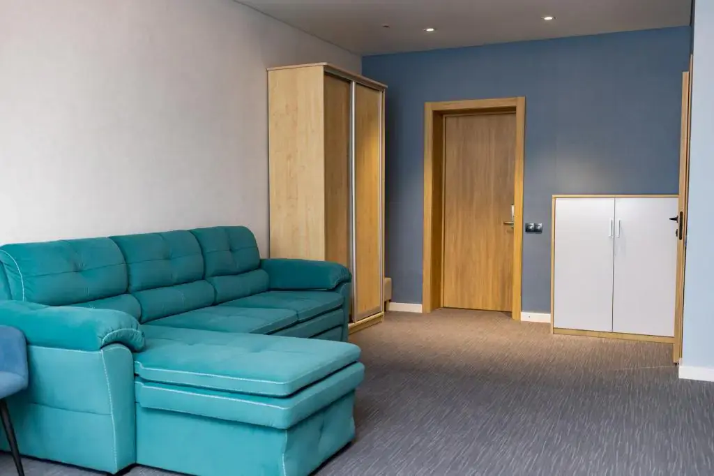 Двухместные номера в гостинице «SkyDream» расположены на втором этаже здания. Оснащены двуспальными кроватями, прикроватными тумбами, двумя креслами, столом, стульями, телевизором, диваном, прихожей.