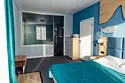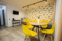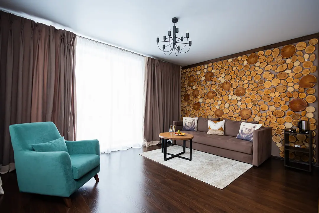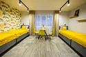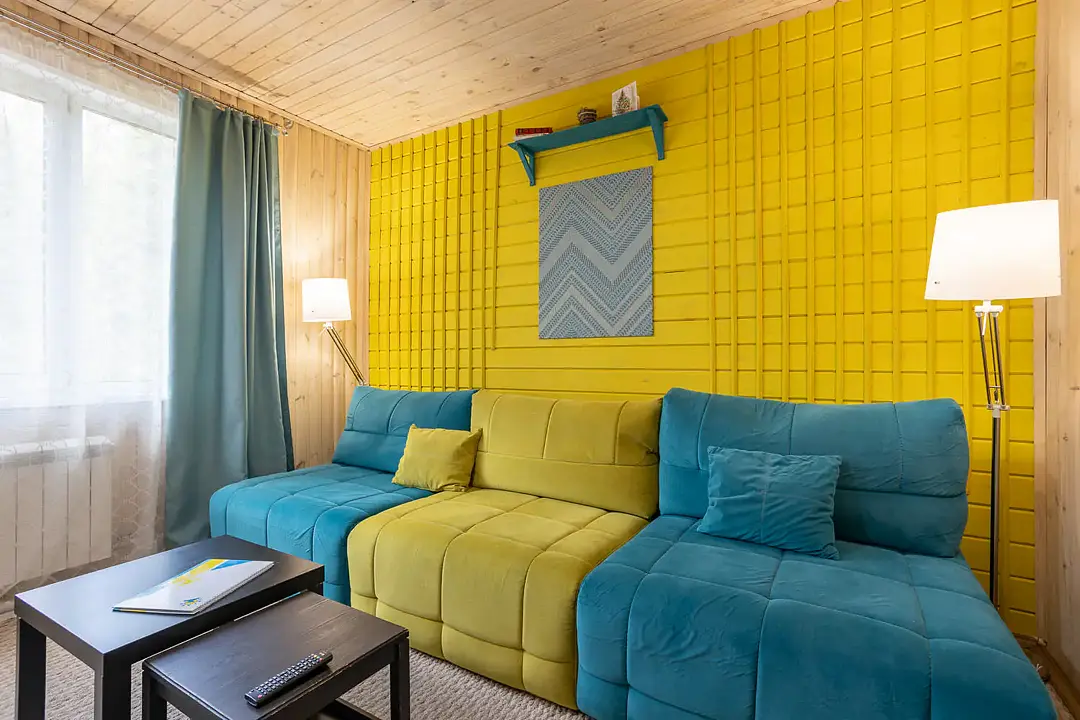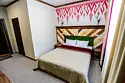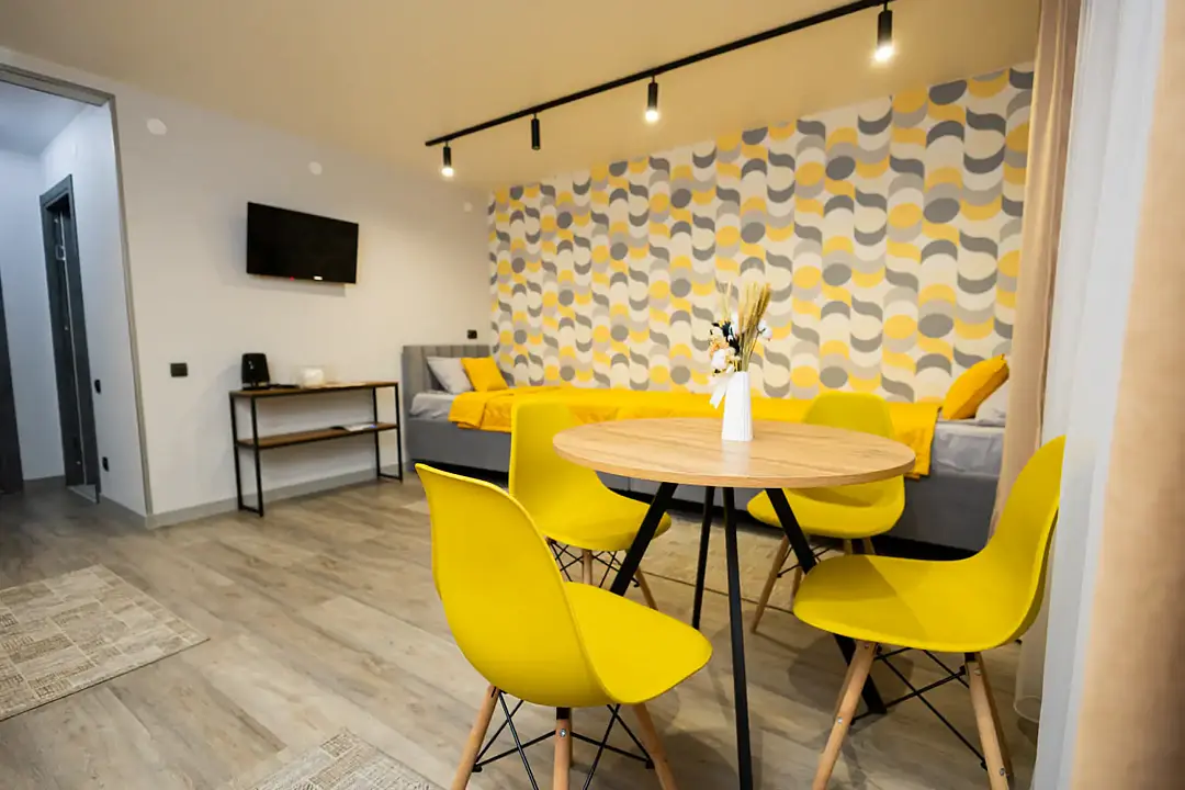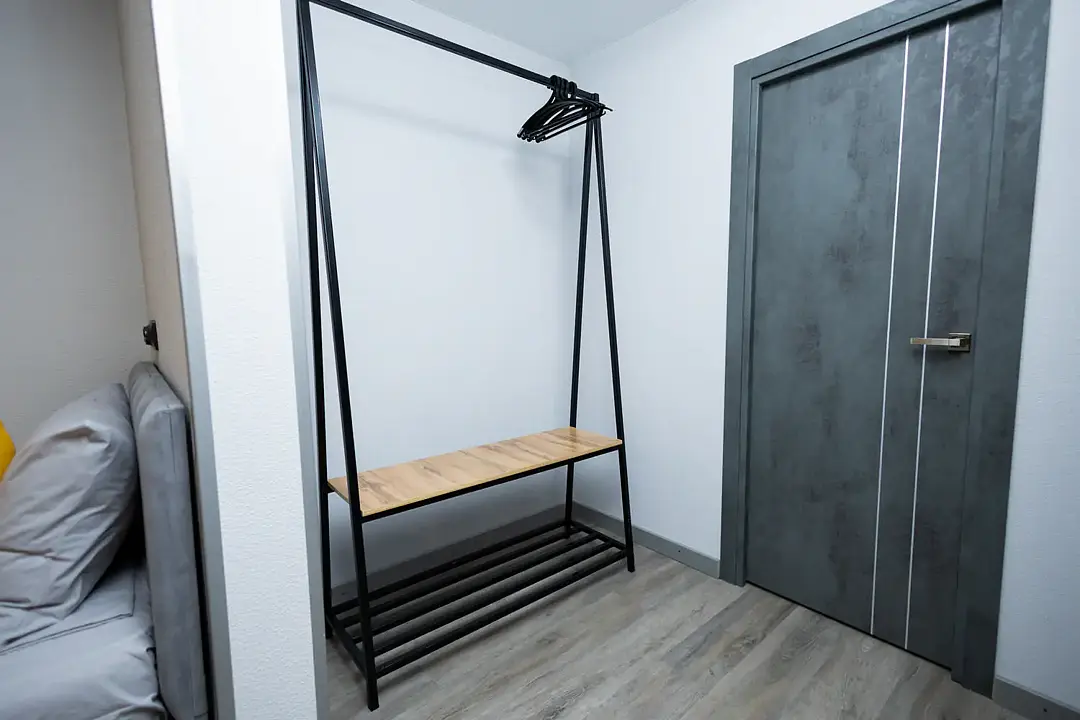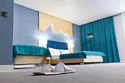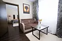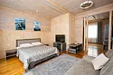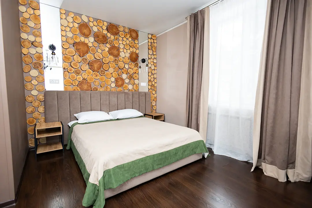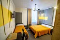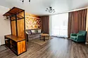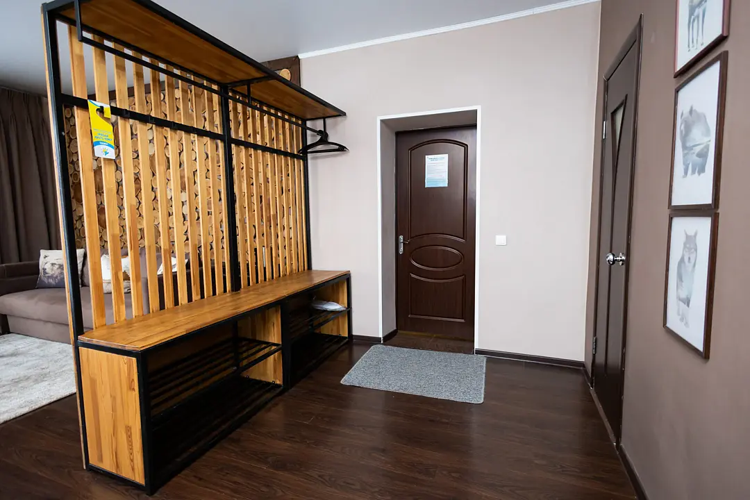 Двухместные номера в гостинице «SkyDream» расположены на втором этаже здания. Оснащены двуспальными кроватями, прикроватными тумбами, двумя креслами, столом, стульями, телевизором, диваном, прихожей.
