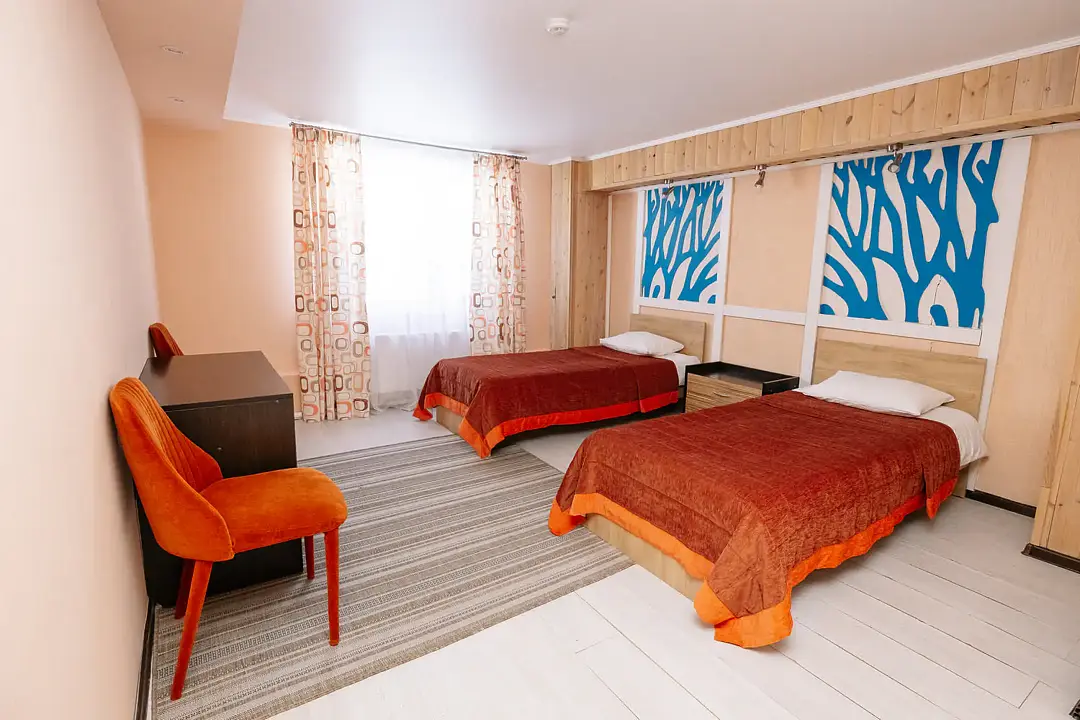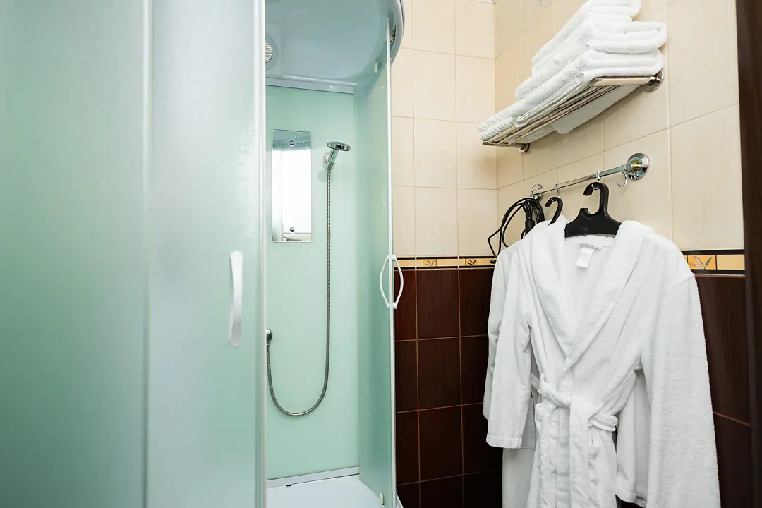 В номере две раздельные кровати (сдвигаются по требованию), телевизор, санузел, душевая кабина, чайник, продукция индивидуального пользования (комплект полотенец, гель для душа, шампунь, зубной набор).
