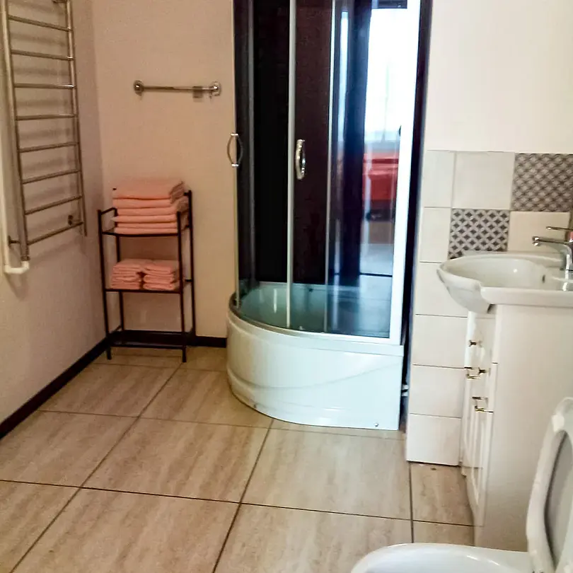 В номере прикроватная тумба, стол, стулья, мини-холодильник, чайник, мини-диван, санузел с душем, комплект полотенец.
