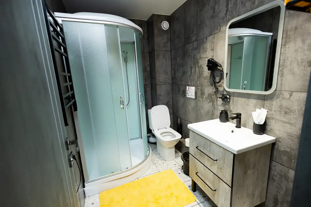 В ванной комнате — душевая кабина, санузел, комплект полотенец, гостиничная парфюмерия (мыло, шампунь, паста, зубная щетка, гель для душа)