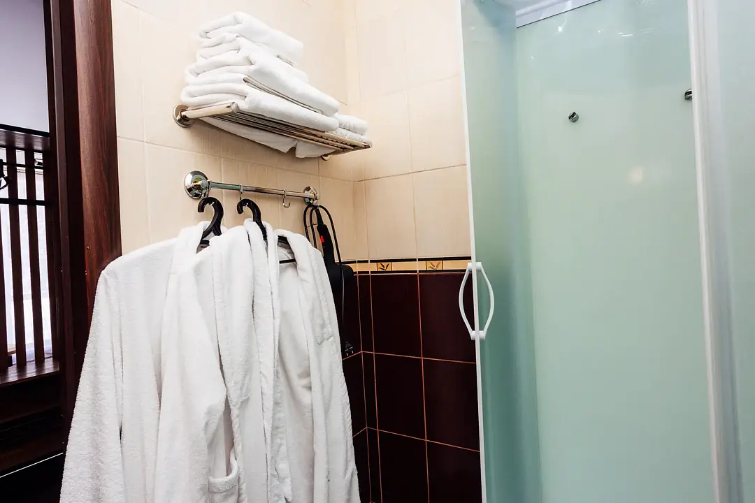 В номерах прикроватная тумба, стол, стулья, санузел с душем, комплект полотенец.