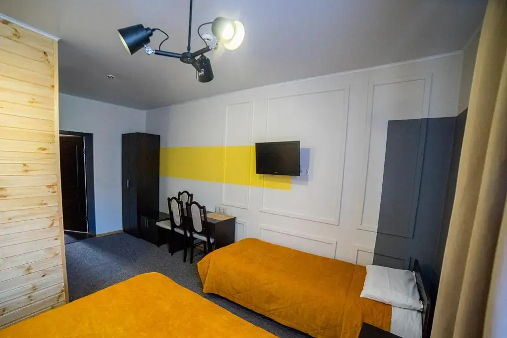 Двухместные номера в гостинице «SkyDream» расположены на втором этаже здания. Оснащены двуспальными кроватями, прикроватными тумбами, двумя креслами, столом, стульями, телевизором, прихожей.