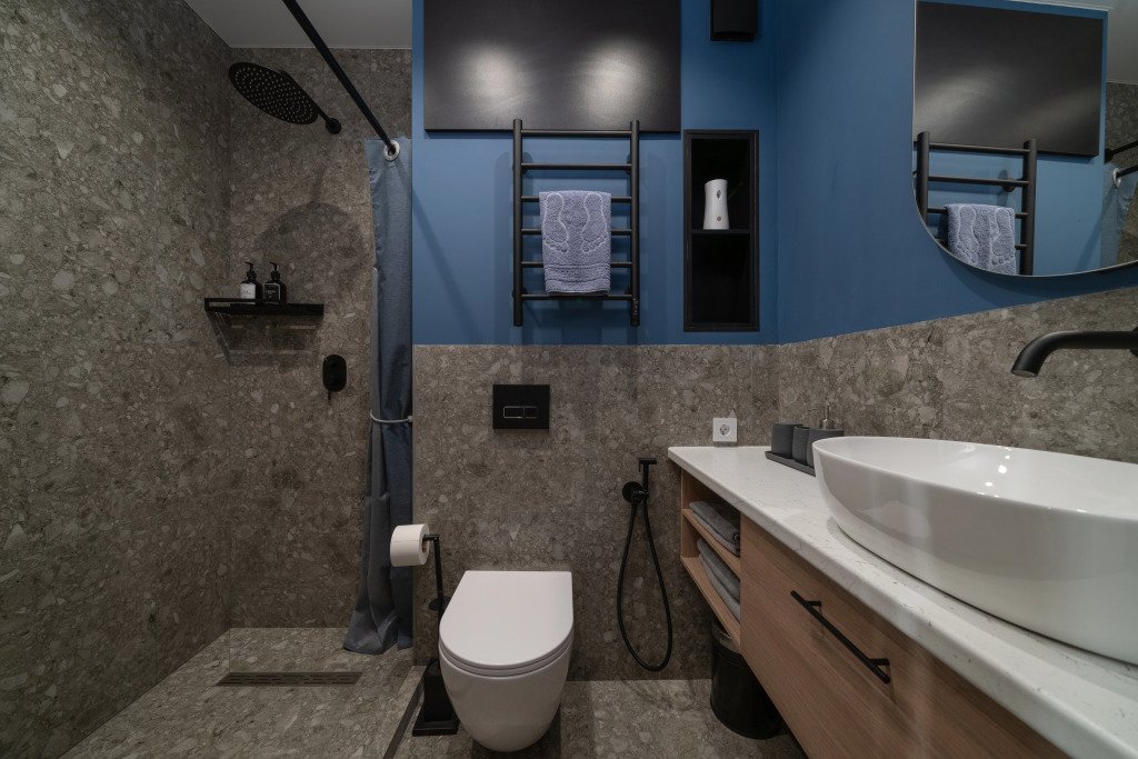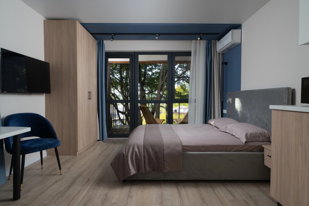 В одной комнате располагается двуспальная кровать. в другой – удобное спальное место для двоих детей или одного взрослого. Номера оборудованы кухонной зоной, современной ванной комнатой и теплым полом. Индивидуальная терраса с видом на море для уединенного отдыха.