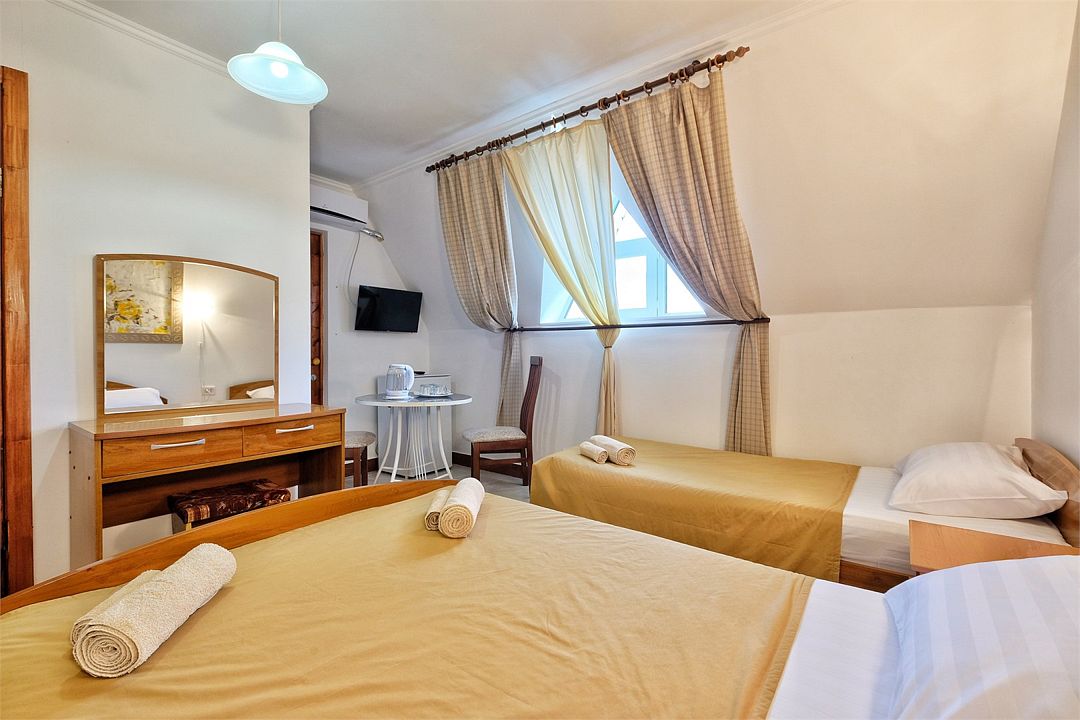 Wi-Fi, холодильник, кондиционер, ванная комната, банные полотенца, кровать «Queen size», односпальная кровать, ортопедический матрас, тумбы, стулья, шкаф для одежды, вешалки, чайник, стаканы, туалетный столик, телевизор с плоским экраном, вид на горы, мансардные окнаВ гостиничном номере
