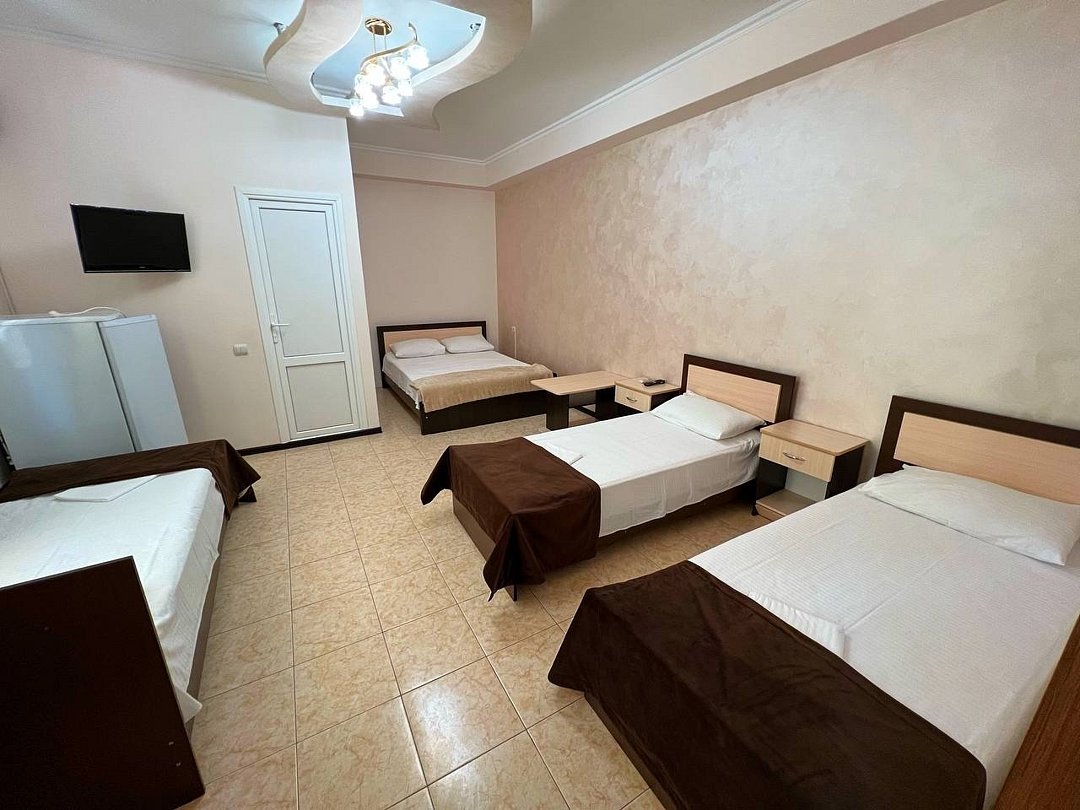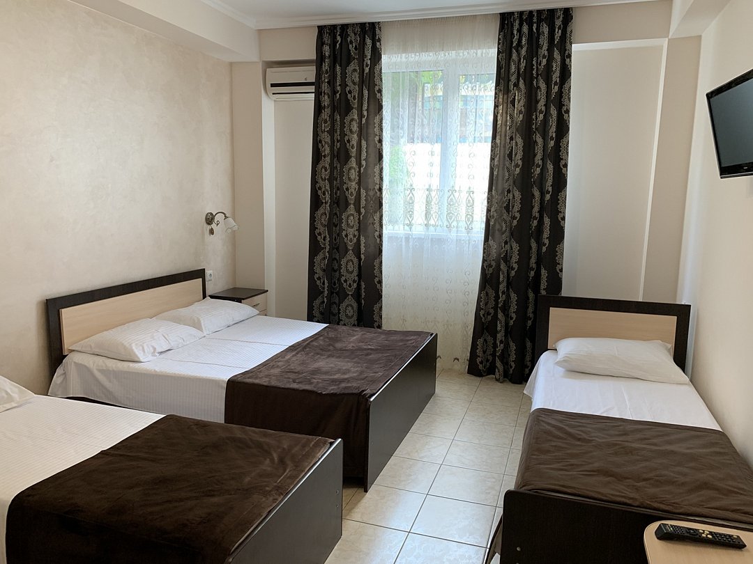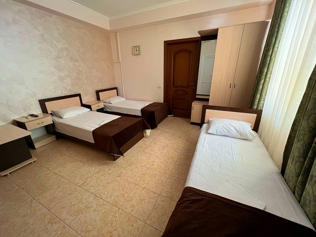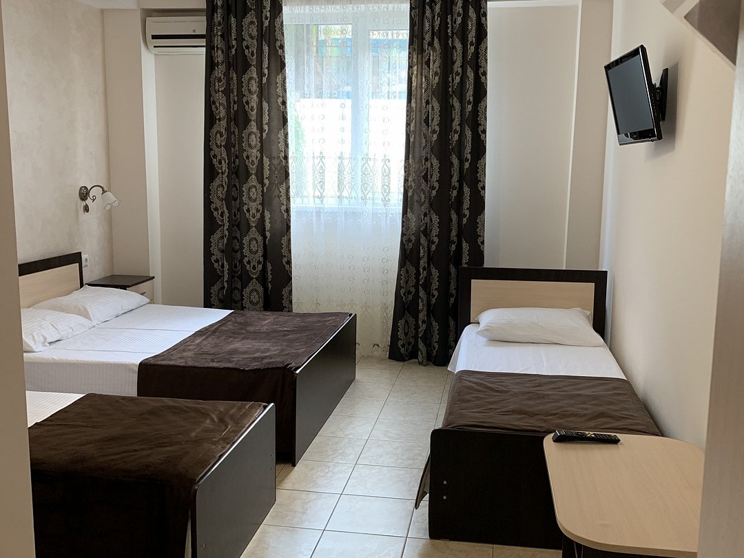 Одно комнатный номер С не большой террасой , выходит на внутренний зеленый дворик Одна кровать двухспальная , две кровати односпальные Четыре прикроватные тумбочки Один гардероб Один столик , и два стула Свой сан узел , душевая , умывальник , унитаз Банное и лицевое полотенца на каждого человека , одноразовые тапочки , разовые средства гигиены Телевизор Холодильник Кондиционер WifiВ номере