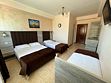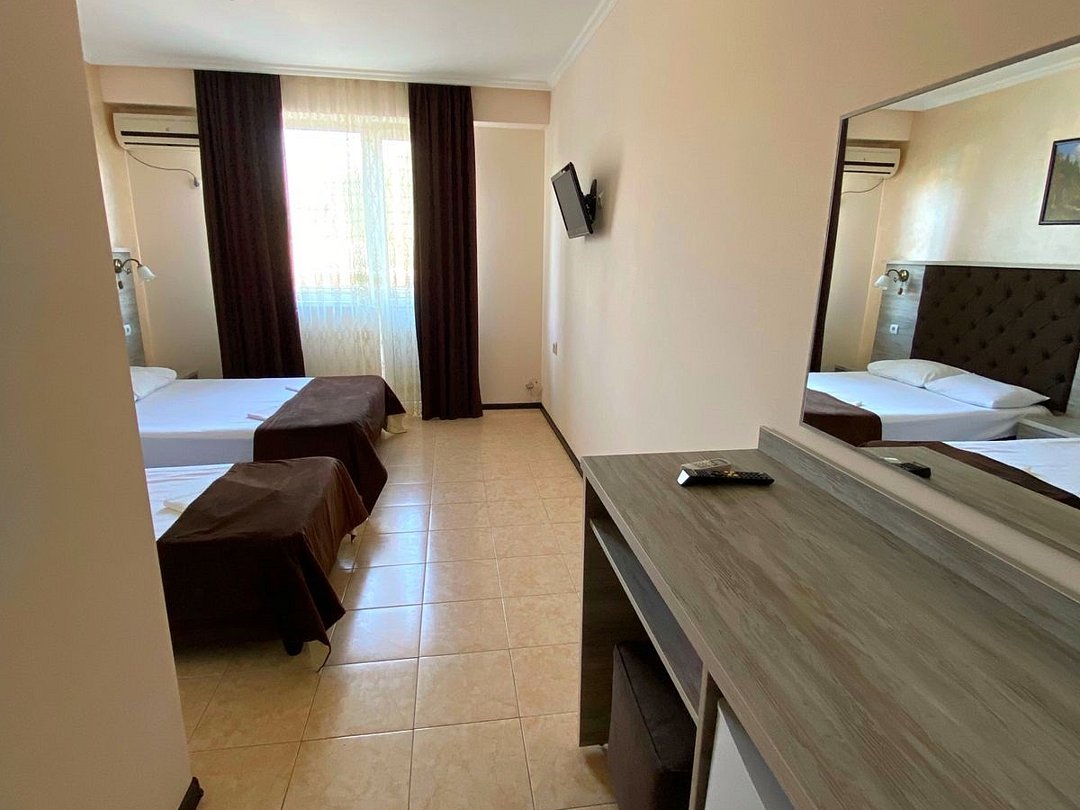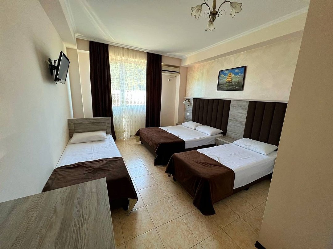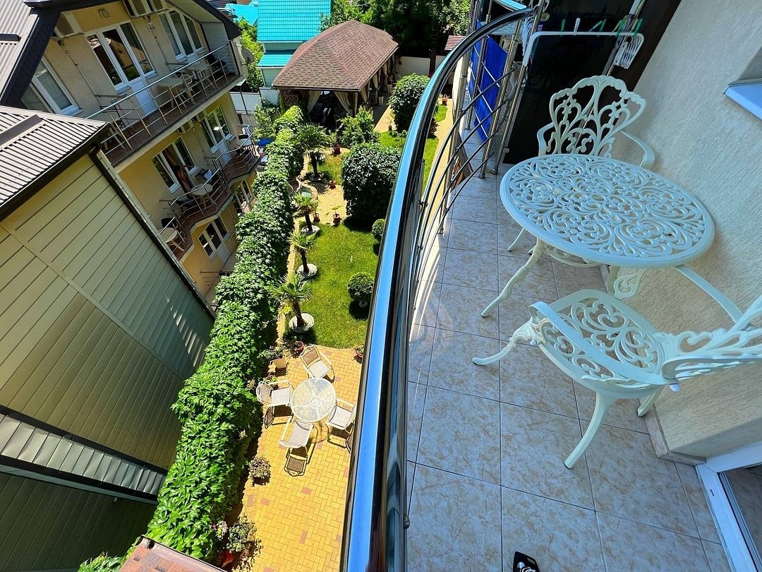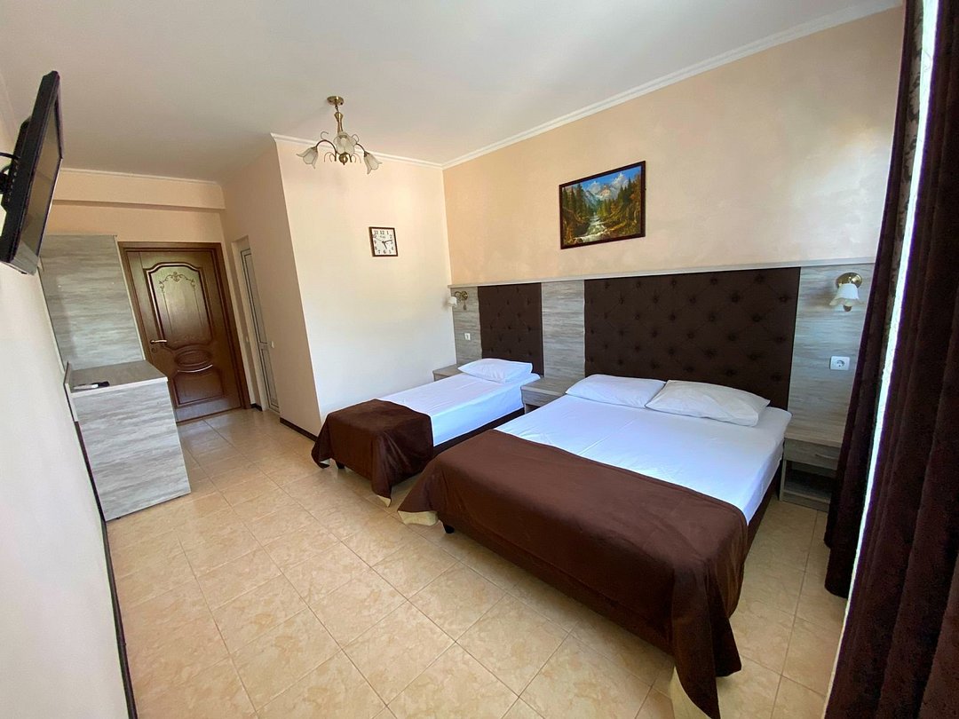 Одно комнатный номер С не большой террасой , выходит на внутренний зеленый дворик Одна кровать двухспальная , две кровати односпальные Четыре прикроватные тумбочки Один гардероб Один столик , и два стула Свой сан узел , душевая , умывальник , унитаз Банное и лицевое полотенца на каждого человека , одноразовые тапочки , разовые средства гигиены Телевизор Холодильник Кондиционер WifiВ номере