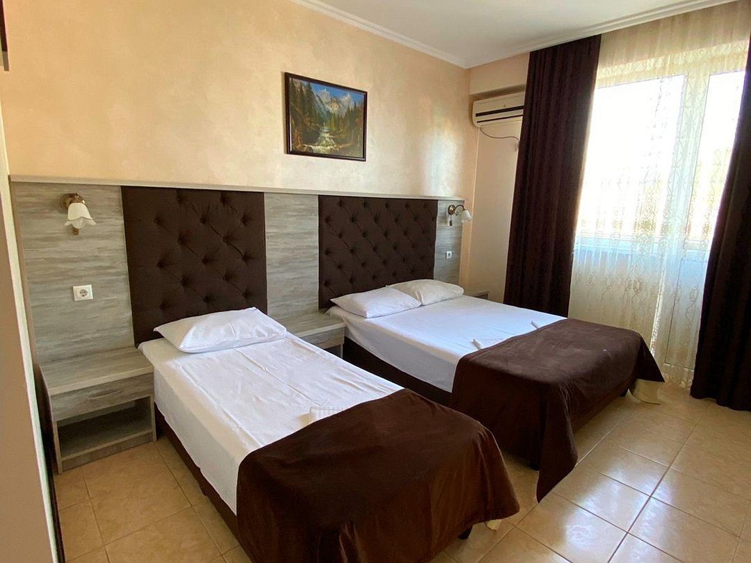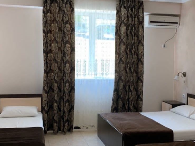 Одно комнатный номер С балконом , балкон выходит на поселок и горы Одна кровать двухспальная , одна кровать односпальная Три прикроватные тумбочки Один гардероб Один столик , и два стула Свой сан узел , душевая , умывальник , унитаз Банное и лицевое полотенца на каждого человека , одноразовые тапочки , разовые средства гигиены Телевизор Холодильник Кондиционер WifiВ номере
