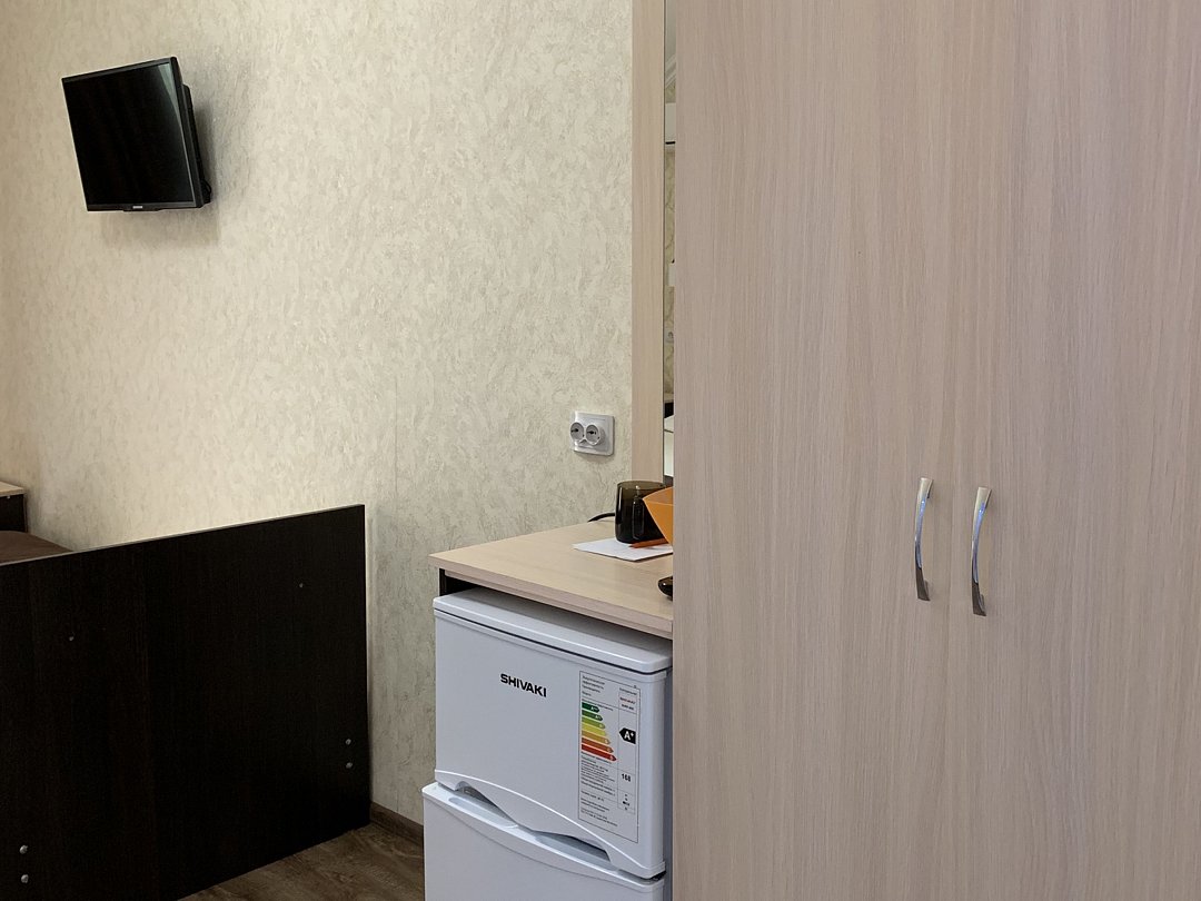 Одно комнатный номер Без балкона ,окно выходит на парковку Одна кровать , двухспальная Две прикроватные тумбочки Один гардероб Журнальный столик Свой сан узел , душевая , умывальник , унитаз Банное и лицевое полотенца на каждого человека , одноразовые тапочки , разовые средства гигиены Телевизор Холодильник Кондиционер WifiВ номере