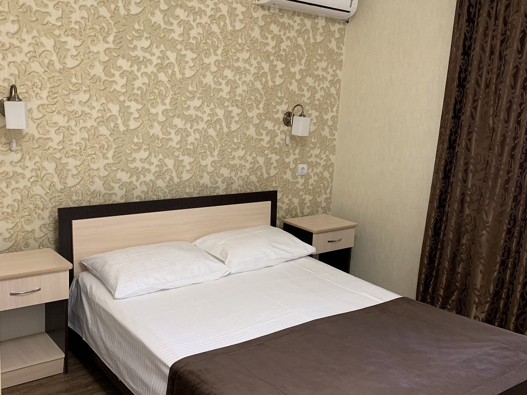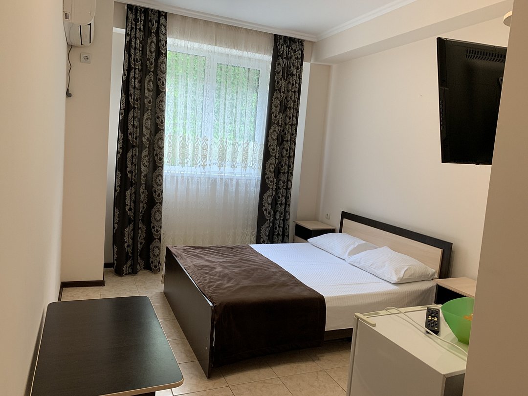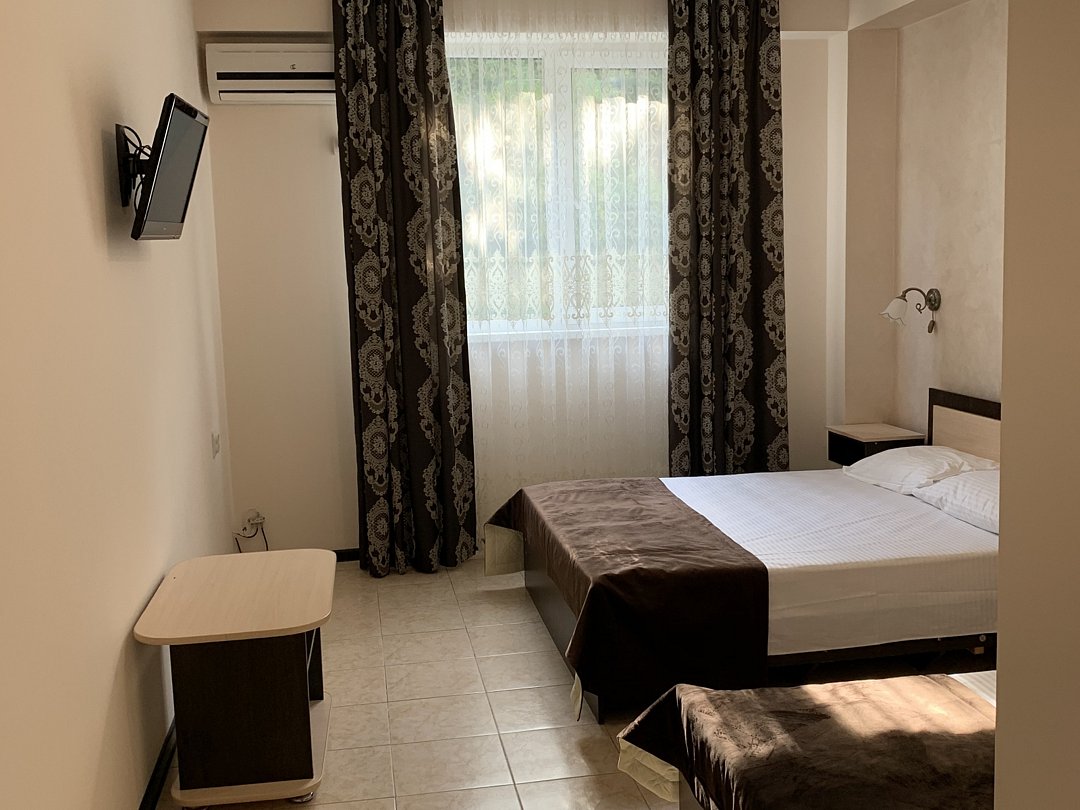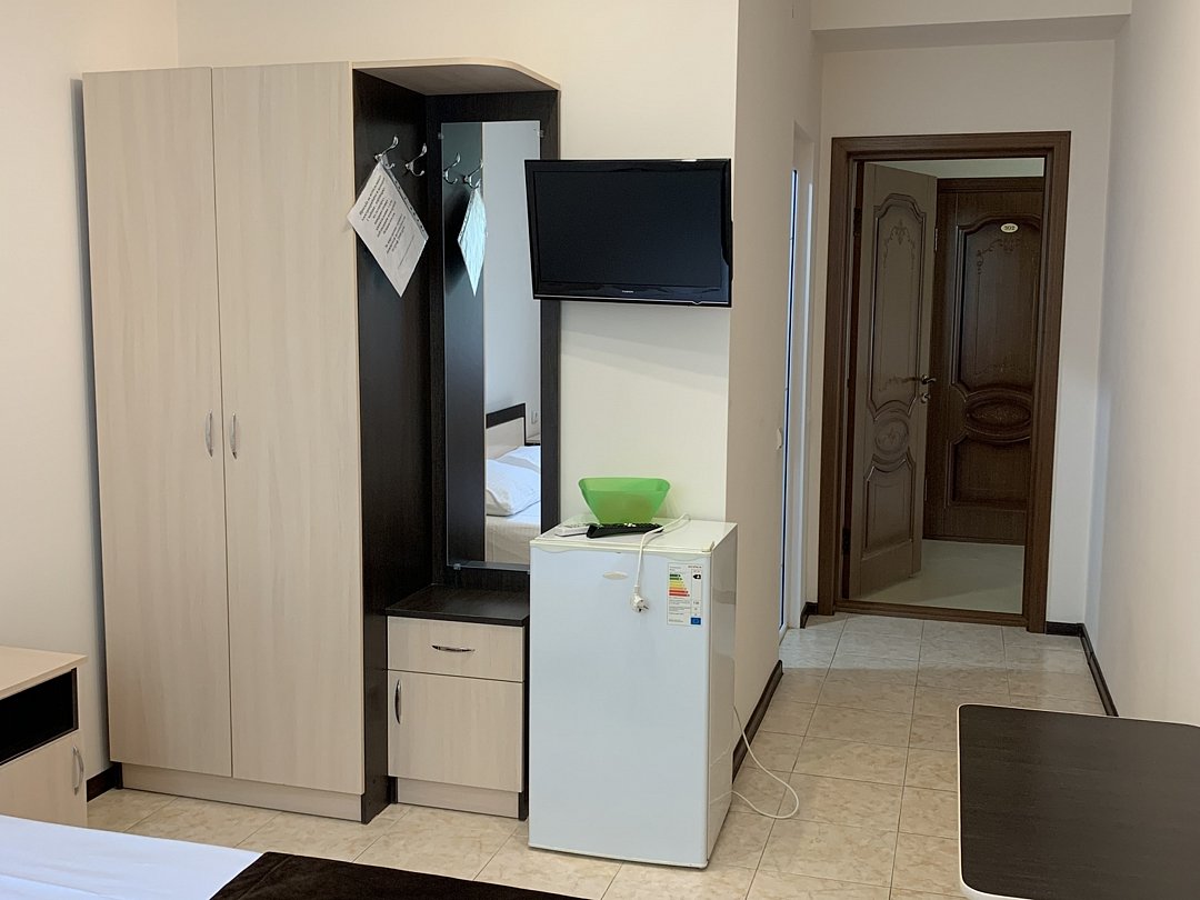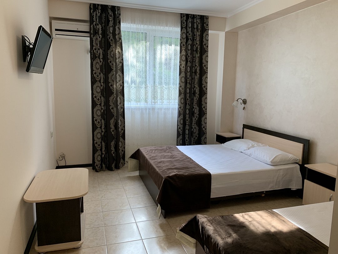 Одно комнатный номер С не большой террасой , выходит на внутренний зеленый дворик Одна кровать двухспальная , одна кровать односпальная Три прикроватные тумбочки Один гардероб Один столик , и два стула Свой сан узел , душевая , умывальник , унитаз Банное и лицевое полотенца на каждого человека , одноразовые тапочки , разовые средства гигиены Телевизор Холодильник Кондиционер WifiВ номере