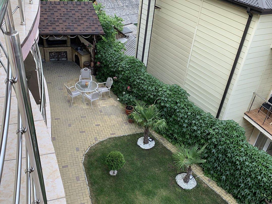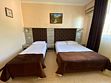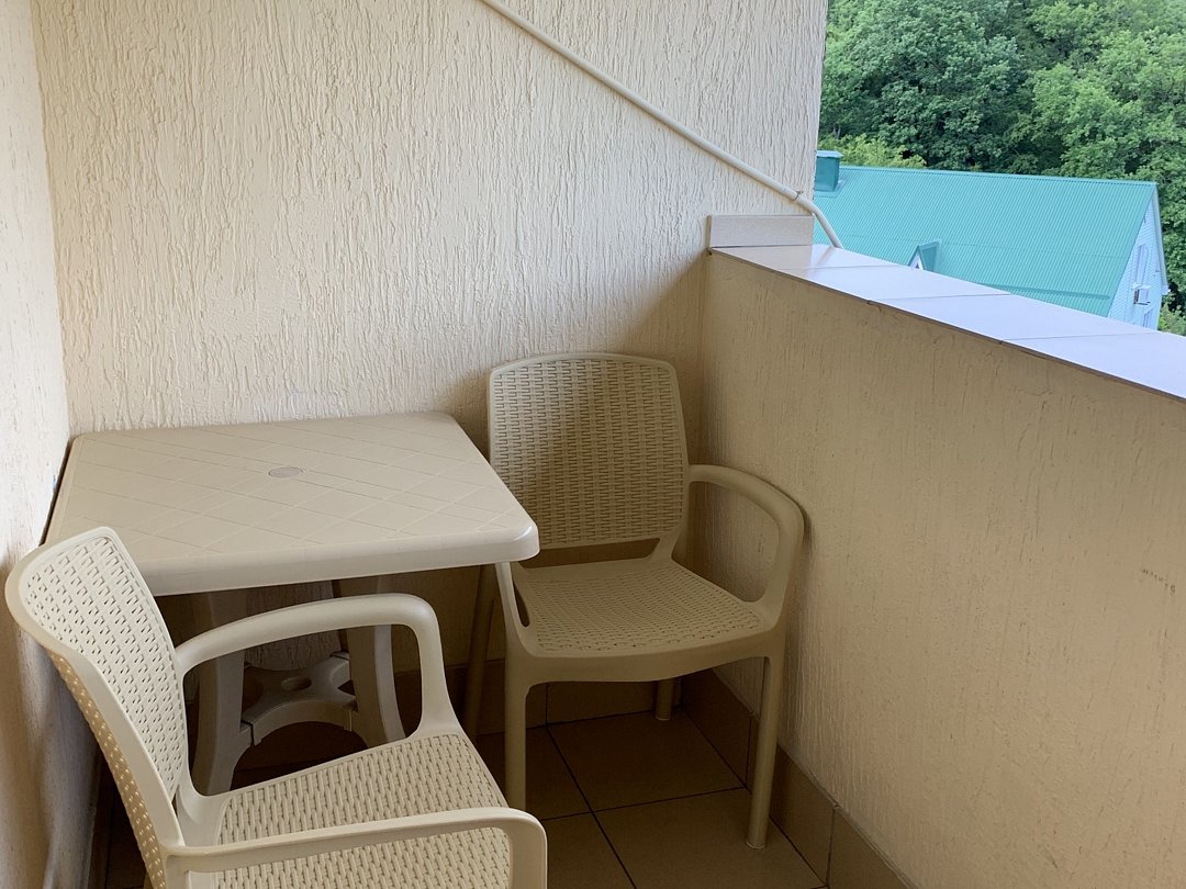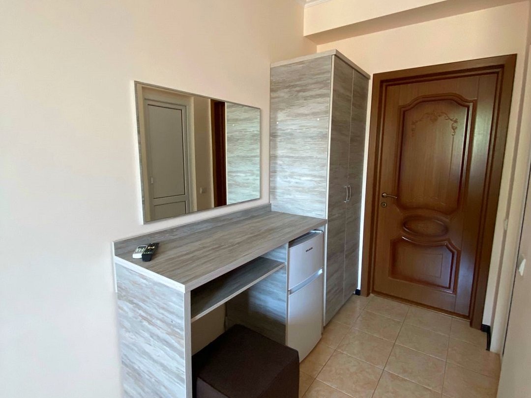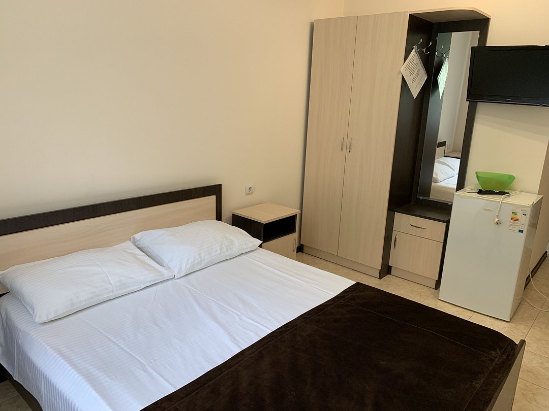 Одно комнатный номер С не большой террасой , выходит на внутренний зеленый дворик Одна кровать двухспальная , одна кровать односпальная Три прикроватные тумбочки Один гардероб Один столик , и два стула Свой сан узел , душевая , умывальник , унитаз Банное и лицевое полотенца на каждого человека , одноразовые тапочки , разовые средства гигиены Телевизор Холодильник Кондиционер WifiВ номере