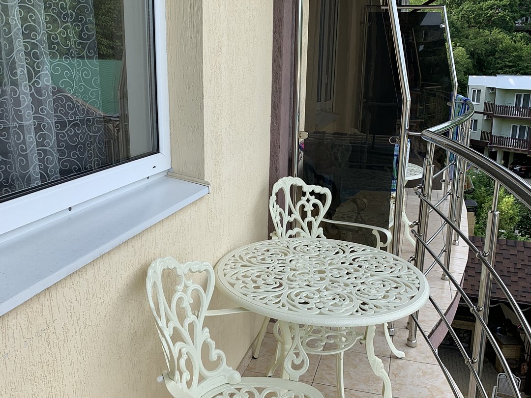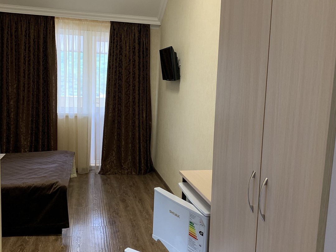 Одно комнатный номер С балконом , вид с балкона на поселок и горы Одна кровать , двухспальная Две прикроватные тумбочки Один гардероб Один столик ,и два стула Свой сан узел , душевая , умывальник , унитаз Банное и лицевое полотенца на каждого человека , одноразовые тапочки , разовые средства гигиены Телевизор Холодильник Кондиционер WifiВ номере