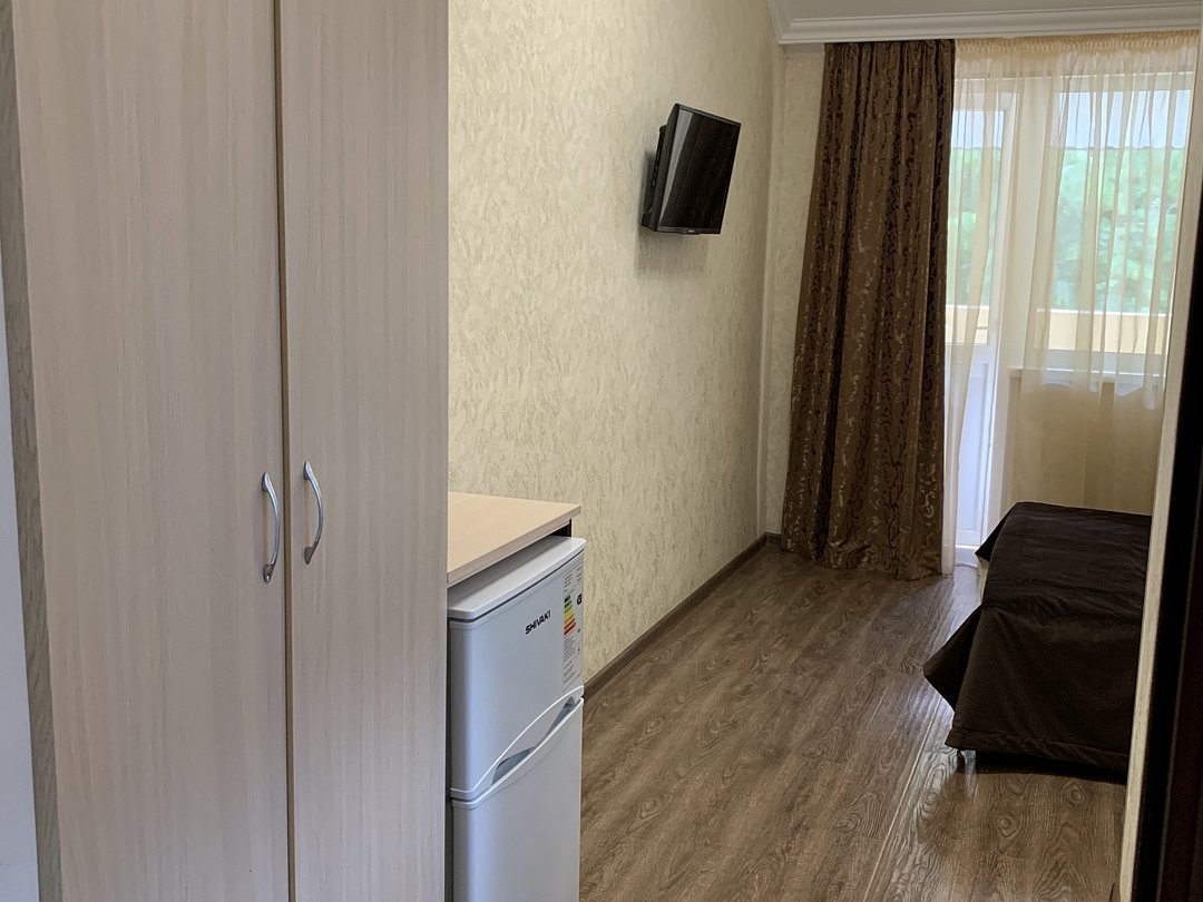 Одно комнатный номер С балконом , балкон выходит на парковку и бассейн Одна кровать , двухспальная Две прикроватные тумбочки Один гардероб Один столик , и два стула Свой сан узел , душевая , умывальник , унитаз Банное и лицевое полотенца на каждого человека , одноразовые тапочки , разовые средства гигиены Телевизор Холодильник Кондиционер WifiВ номере