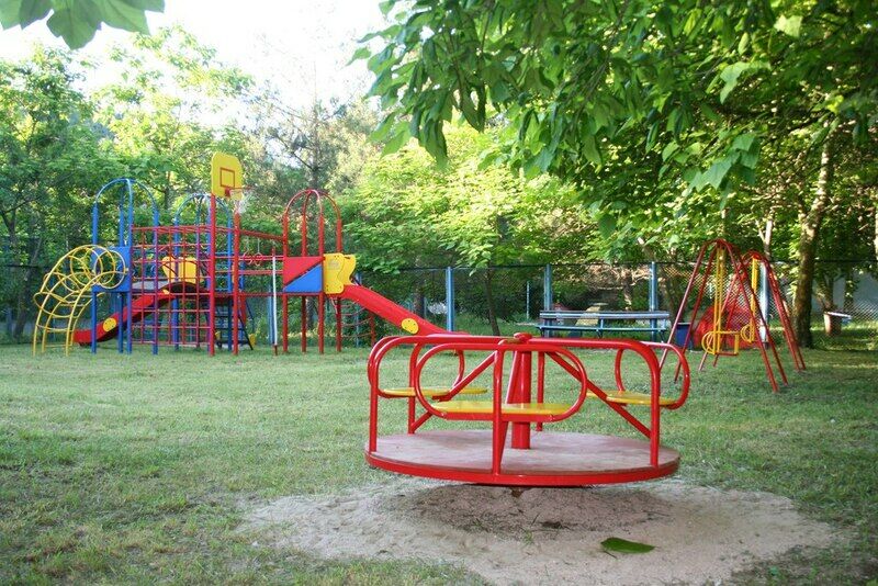 Детский городок оборудован современным игровым детским комплексом: качели, горки, спортивные снаряды.