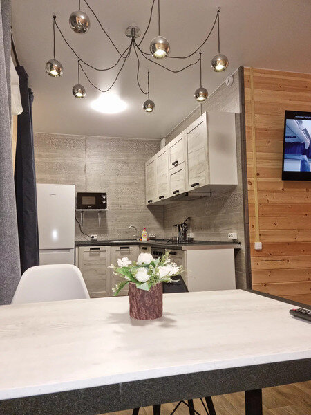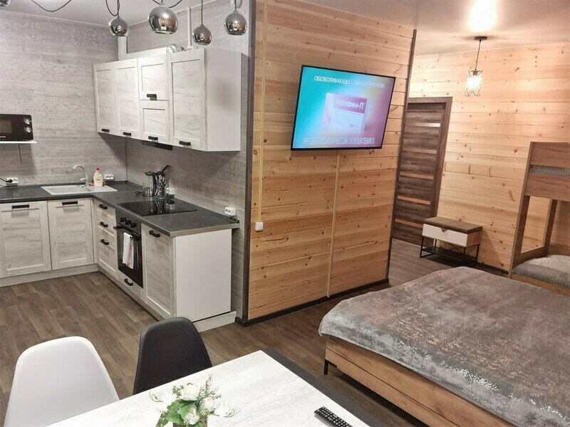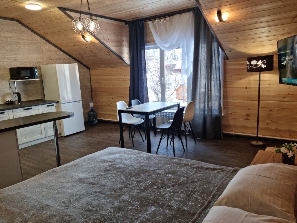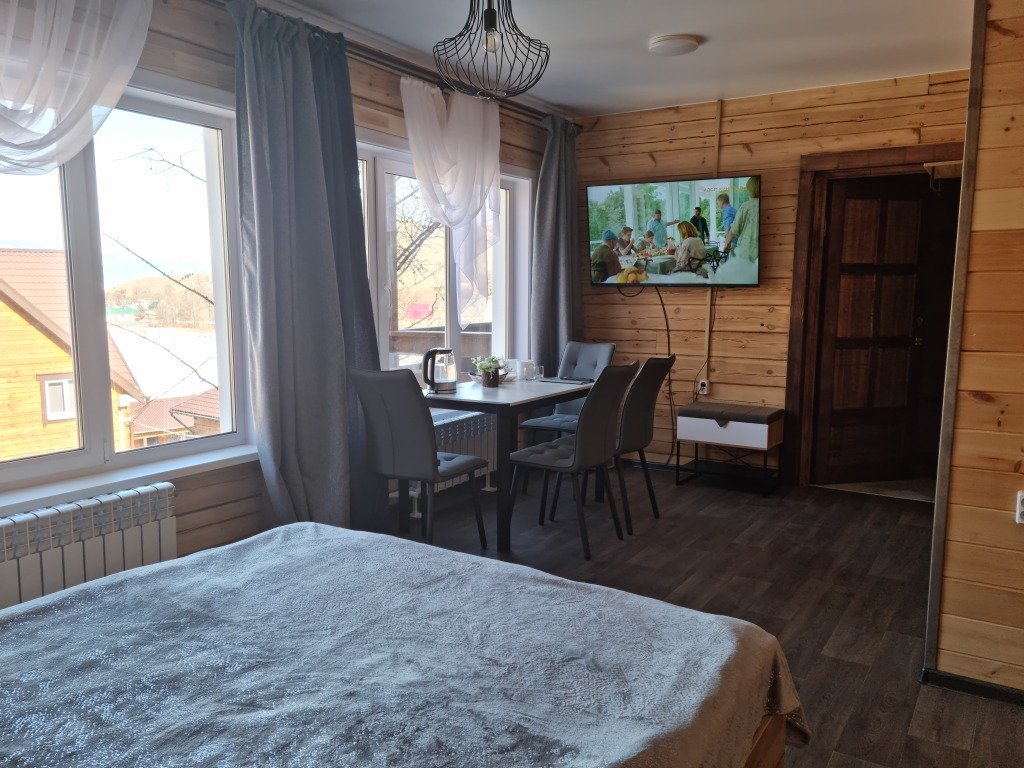 На территории гостевого дома работает бар, где подают разливные напитки и горячую еду. Также в номерном фонде гостевого дома присутствуют апартаменты с уже имеющейся кухней.