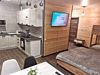 Семейные апартаменты с одной двуспальной кроватью и одной двухъярусной кроватью. Санузел с душевой кабиной. Фен. Кухонная зона с холодильником, плитой, духовым шкафом, посудомоечной машиной, микроволновкой, чайником, посудой. Телевизор, спутниковое ТВ. WiFi. Балкон. Вид на озеро. Общие: Бар. Сауна.Услуги и удобства