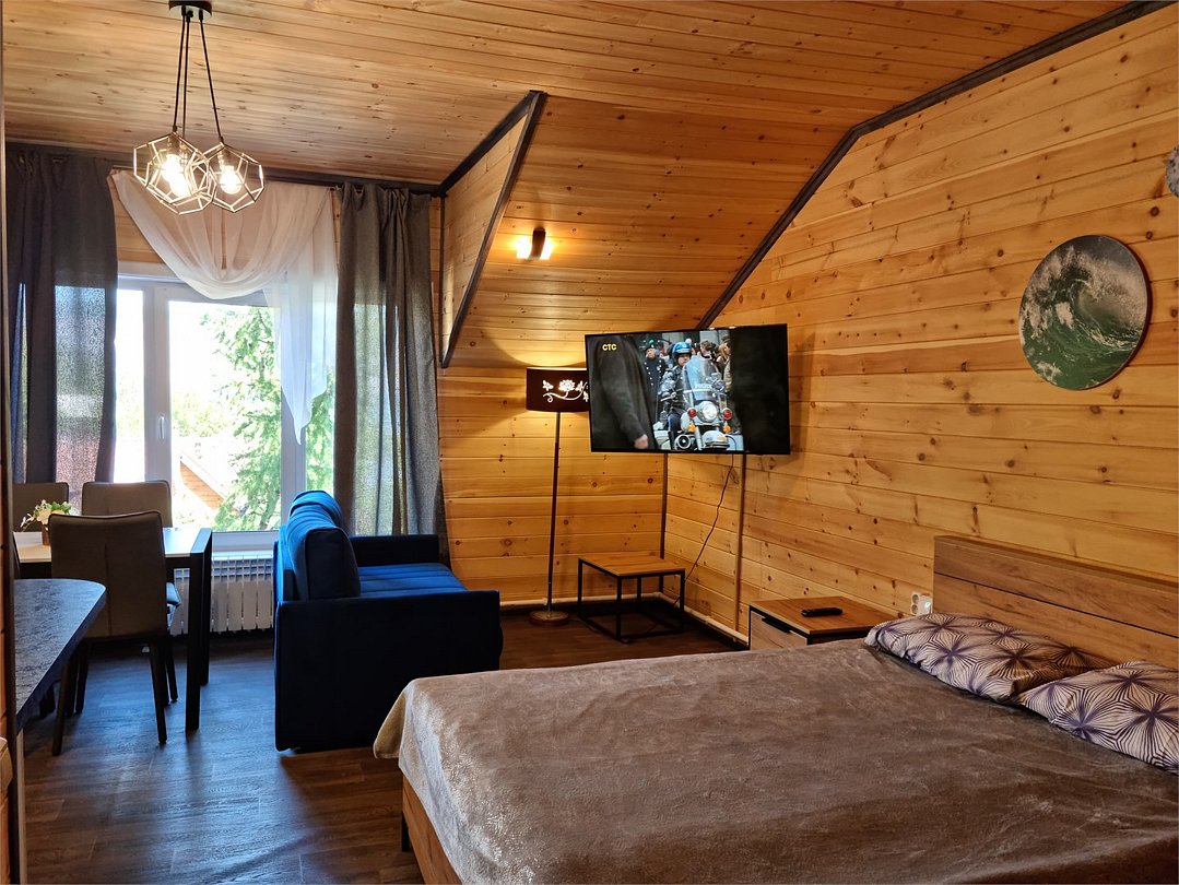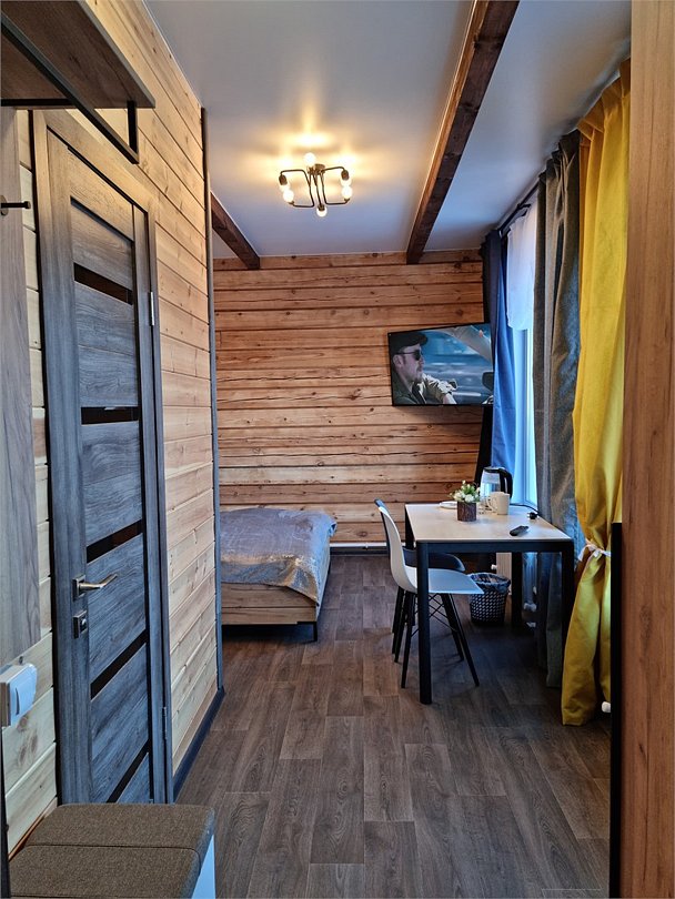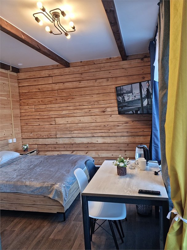 Номер с одной двуспальной кроватью. Санузел с душевой кабиной. Фен. Обеденный стол. Чайник. Чайные принадлежности. Телевизор, спутниковое ТВ. WiFi. Вид во двор. Общая кухня. Бар. Сауна.Услуги и удобства