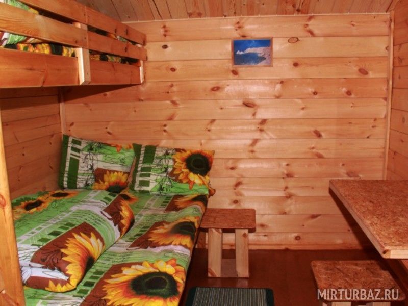 Инфраструктура: Гостевой дом: энергоснабжение, кровати, стол, зеркало, вешалка для одежды. На террасе у домика - столик со скамьей.