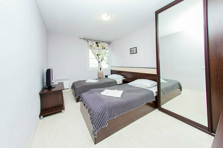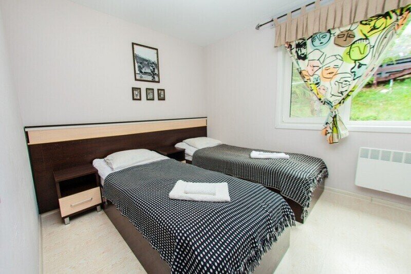 Однокомнатный 2-х местный номер 18 кв.м. с двумя раздельными кроватями или одной двуспальной кроватью, санузел с душевой кабиной, полотенце, спутниковое ТВ, холодильник, необходимая для проживания мебель. Выход на собственный балкон с видом на лес.