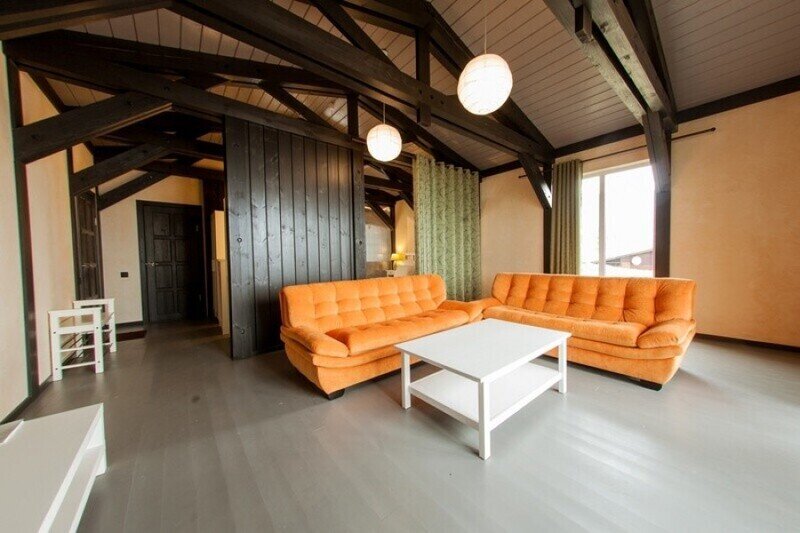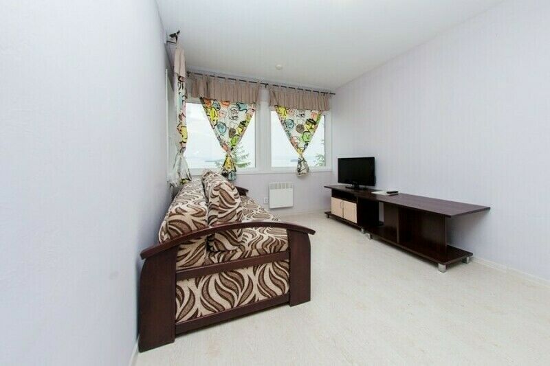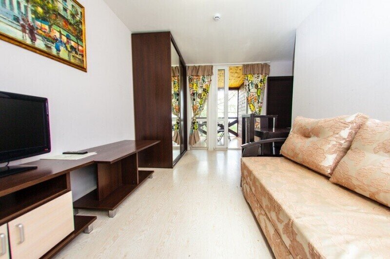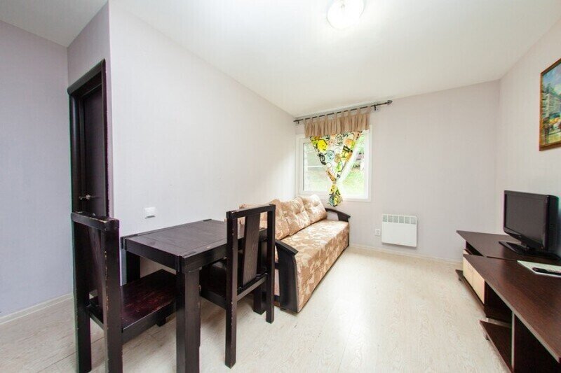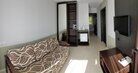 В гостиной большой диван, холодильник, спутниковое ТВ, необходимая для проживания мебель, санузел с душевой кабиной, халаты, есть сейф для хранения ценных вещей.