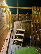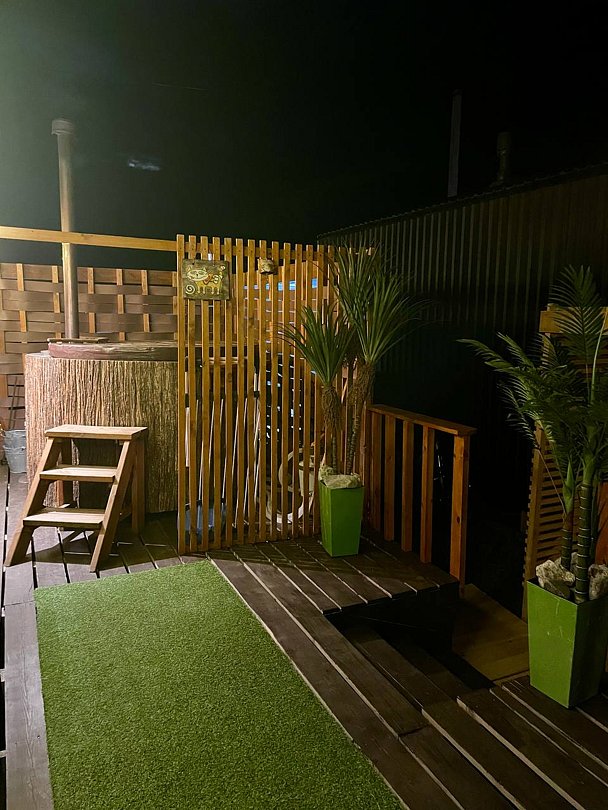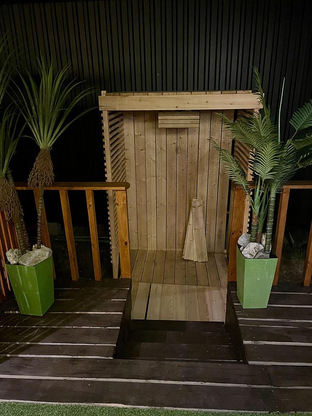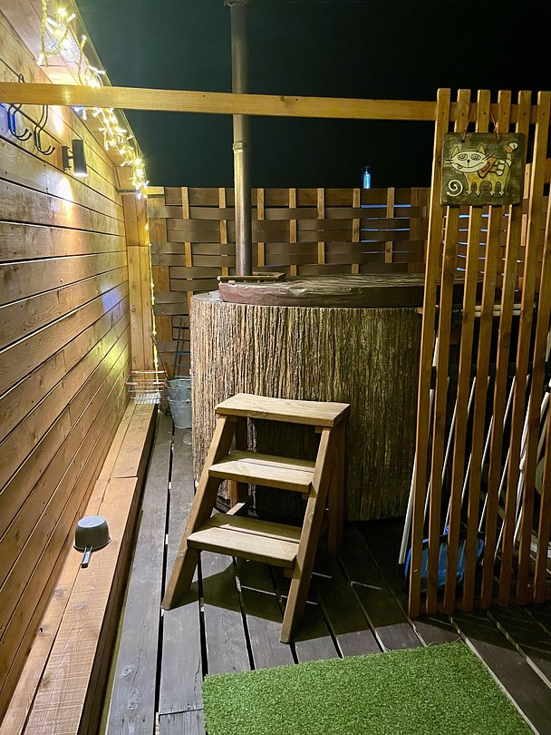 Гостям предлагается уникальная японская водяная баня Фурако, изготовленная из целебного сибирского кедра, который придает ей приятный естественный аромат. Парение под открытым небом, усыпанным звездами, создает атмосферу глубокой релаксации и гармонии с природой. Вместительность — до восьми человек.