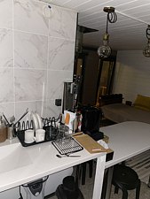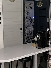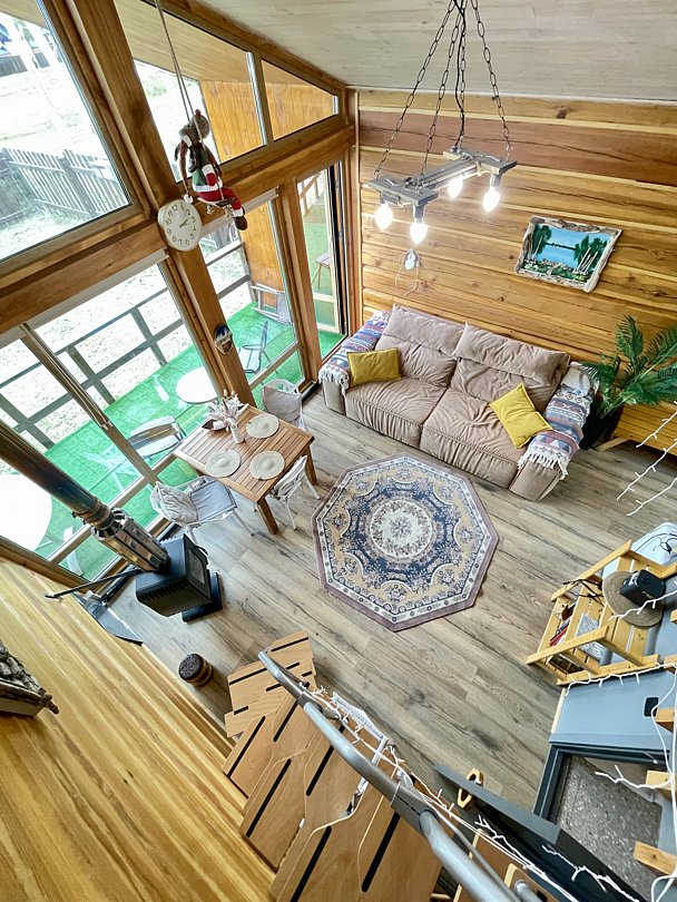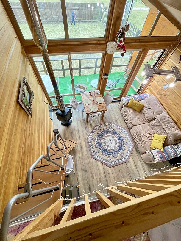 Первый этаж: мини-кухня оборудована всеми необходимыми приборами и посудой, включая холодильное оборудование, микроволновую печь, чайник-термос, посуду и столовые принадлежности. Гостиная совмещена со столовой зоной и оформлена стильной мебелью, здесь также установлен настоящий камин, создающий уютную атмосферу вечера.