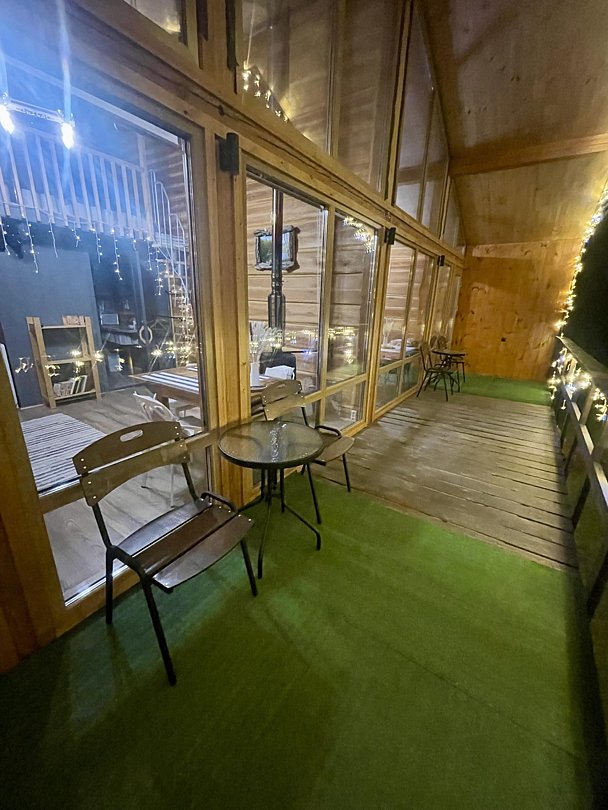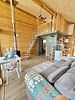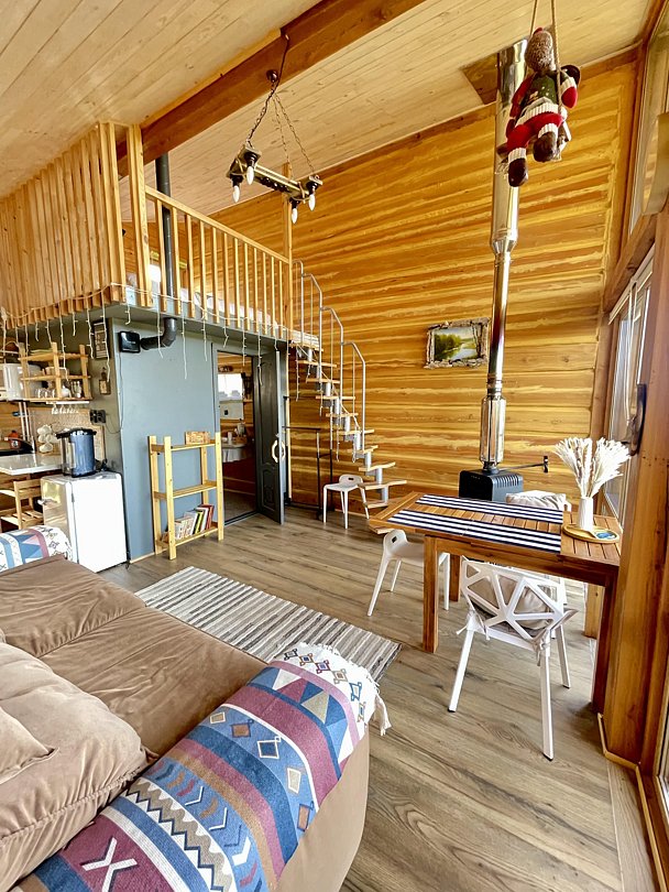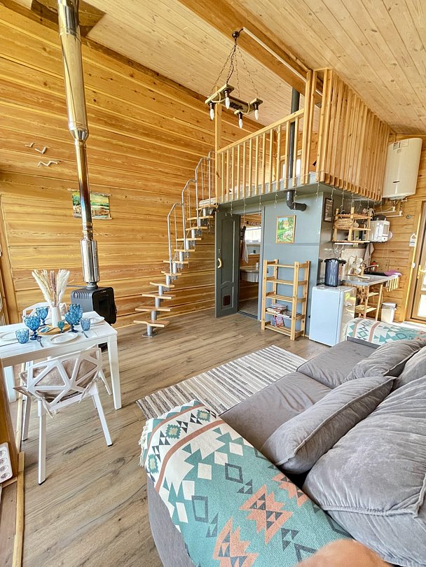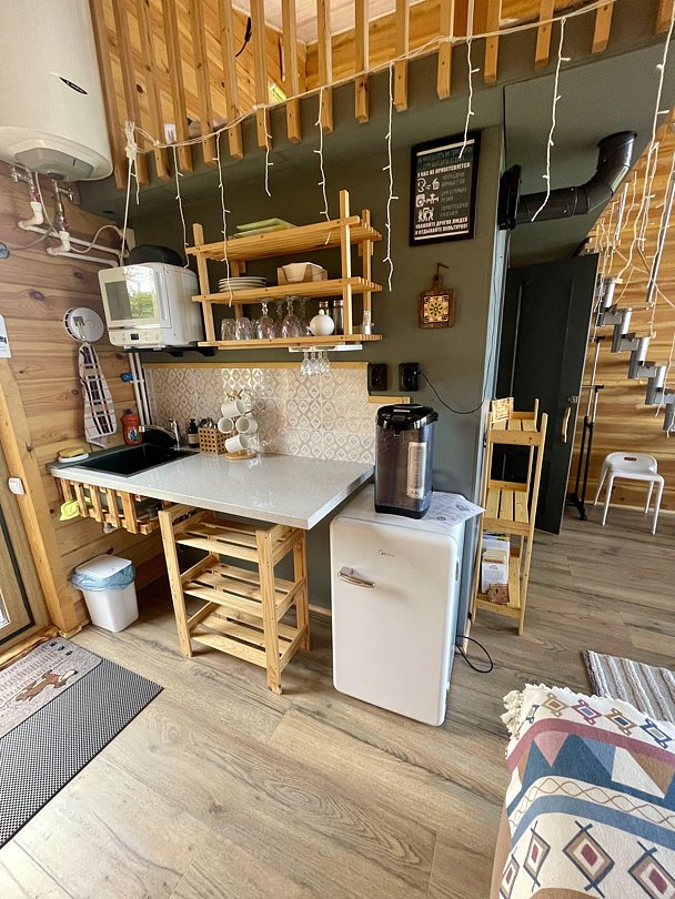 1-й этаж (ярус): гостиная–столовая с обустроенным местом отдыха и уютной атмосферой от декоративного камина, просторная кухня, оснащенная холодильником, микроволновым устройством, электрочайником-термосом, полным набором посуды и столовых приборов. Санузел с гигиеническими принадлежностями, комплектом полотенец, халатами и тапочками.