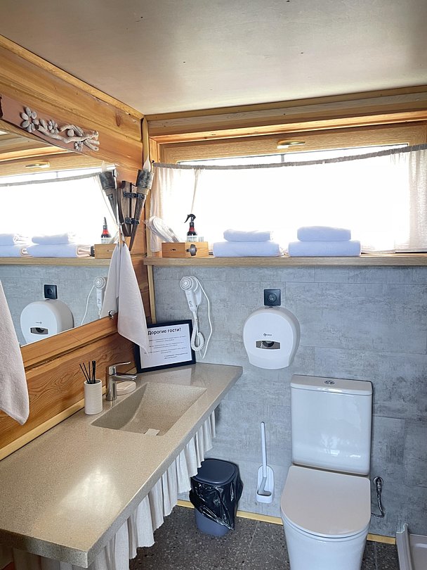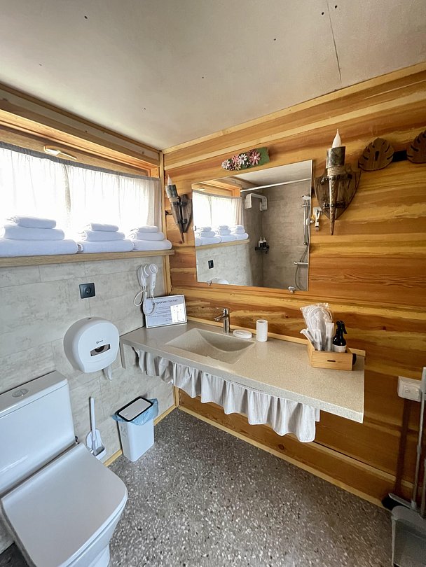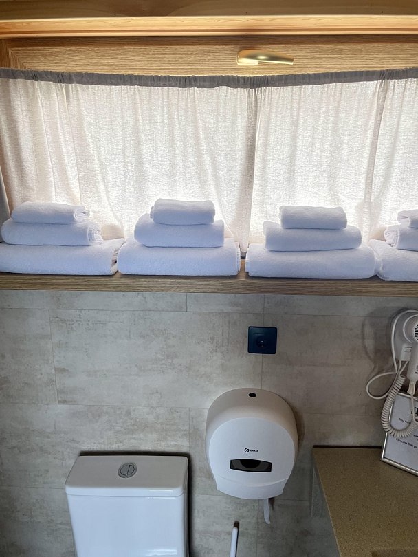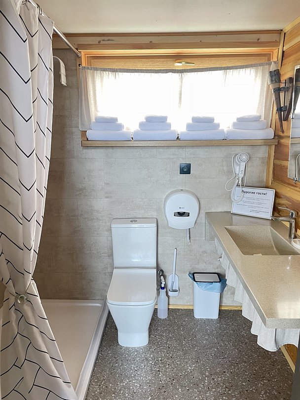 Спальное пространство: предметы личной гигиены предоставляются бесплатно. Набор полотенец, халатов и тапочек доступен каждому проживающему. Фен и другие бытовые устройства облегчают ежедневный уход.