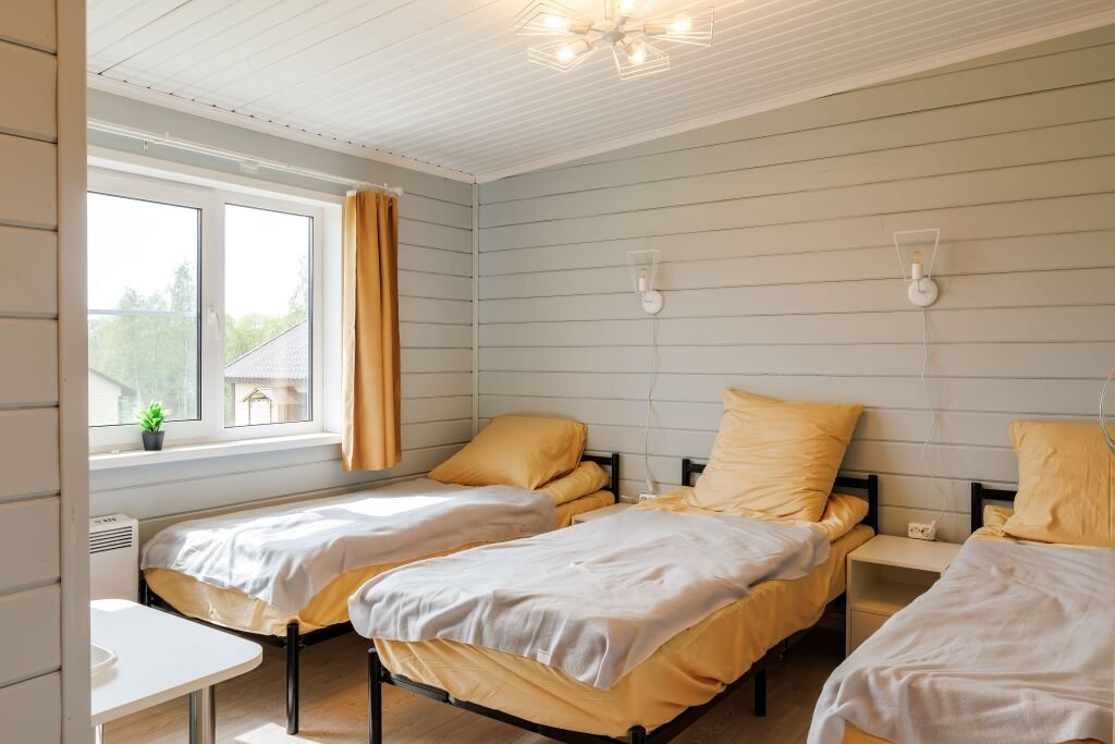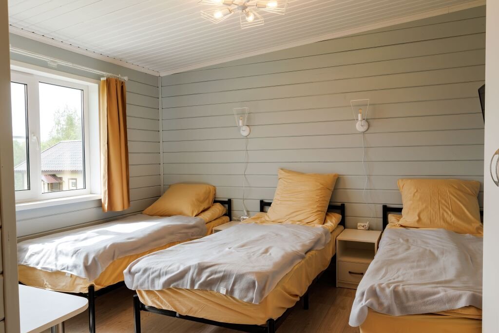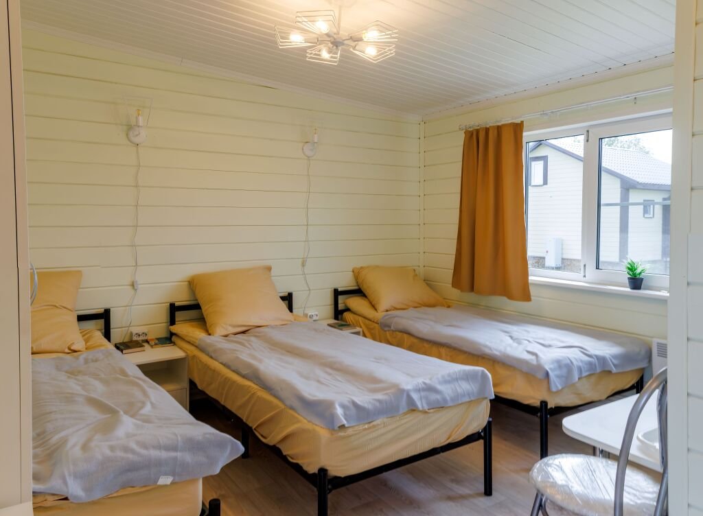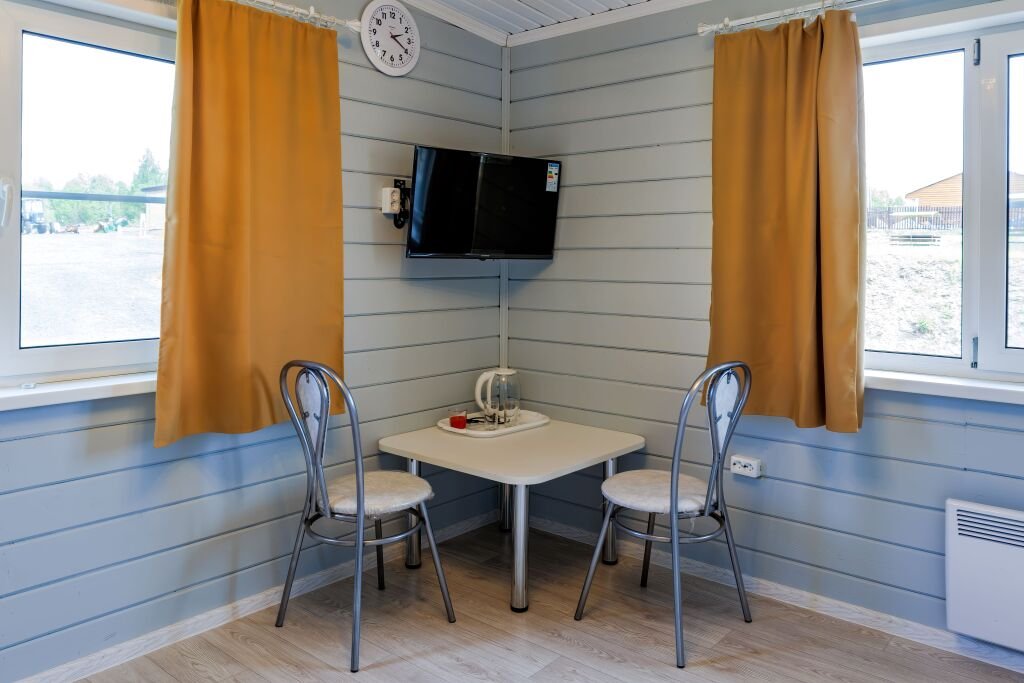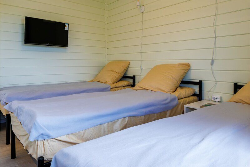 Комфортный номер с тремя отдельными односпальными кроватями. В корпусе гостиницы располагается отдельная кухня столовая со всем необходимым для приготовления и приёма пищи с видом на озеро.