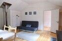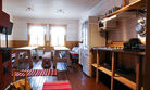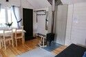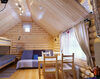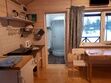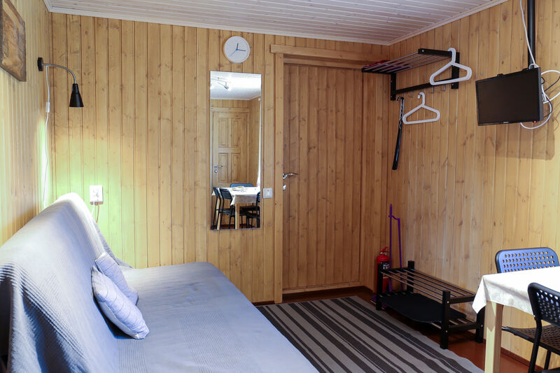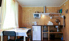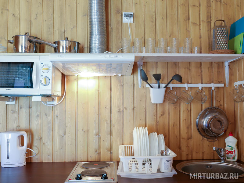 В холле находится одна 2-х ярусная кровать и раскладной диван, обеденный стол, цифровое ТВ, холодильник, кухонная панель с мойкой для посуды, индукционная электроплита с вытяжкой, микроволновая печь, полный набор кухонной и столовой посуды, шведская печь;