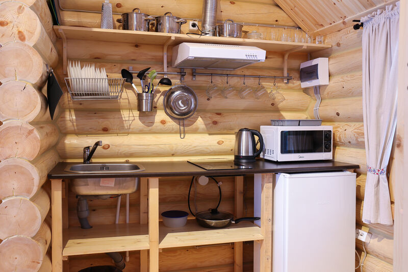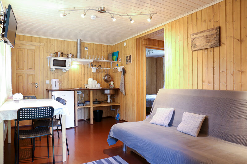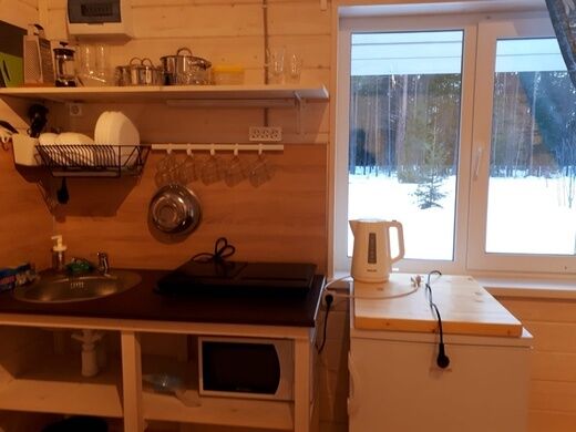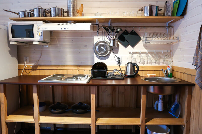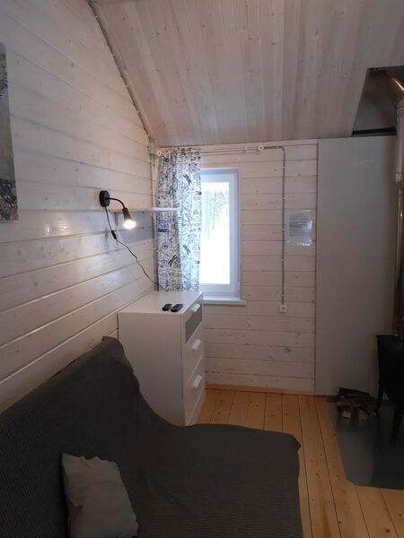 В доме просторная, светлая гостиная с кухней и небольшая спальня с двуспальной кроватью. В доме есть все необходимое для приготовления пищи (микроволновая печь, индукционная плита, электрочайник, посуда на 5 человек и д. р.). Дом оборудован своим отдельным санузлом с душевой кабиной.