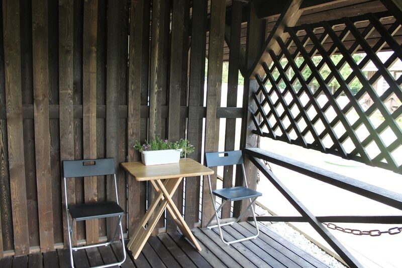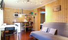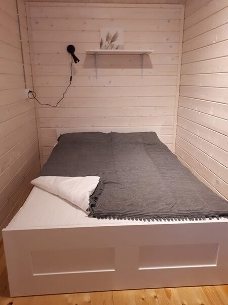 В доме просторная, светлая гостиная с кухонной зоной и небольшая спальня с двуспальной кроватью. В доме есть все необходимое для приготовления пищи (микроволновая печь, индукционная плита, электрочайник, посуда на 4х человек и д. р. Дом оборудован своим отдельным санузлом с душевой кабиной. Есть своя крытая терраса и бесплатная парковка около дома.