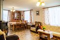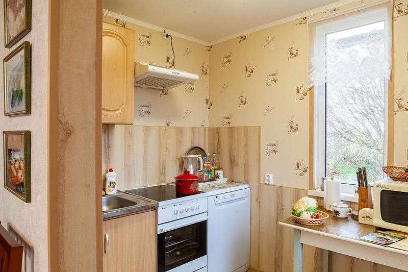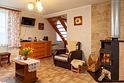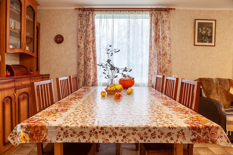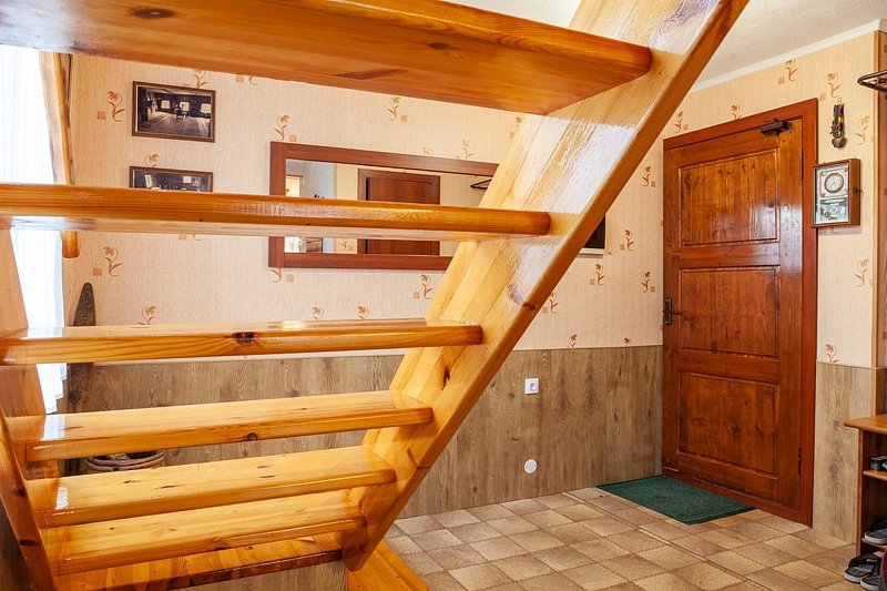 Это двухэтажный каркасный дом. Дизайн дома современный с элементами старины (дизайн и благоустройство продолжается). В доме два этажа общей площадью 85 кв.м. На первом этаже находится холл с камином, объединенный с гостиной, кухня и санузел. Кухня оборудована 4-х конфорочной электрической плитой, посудомоечной машиной, раковиной, холодильником, электрочайником, эл.кофеваркой, полным набором посуды. В гостиной большой деревянный стол со скамьями.