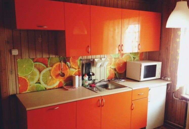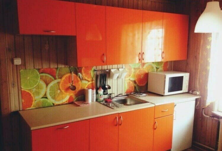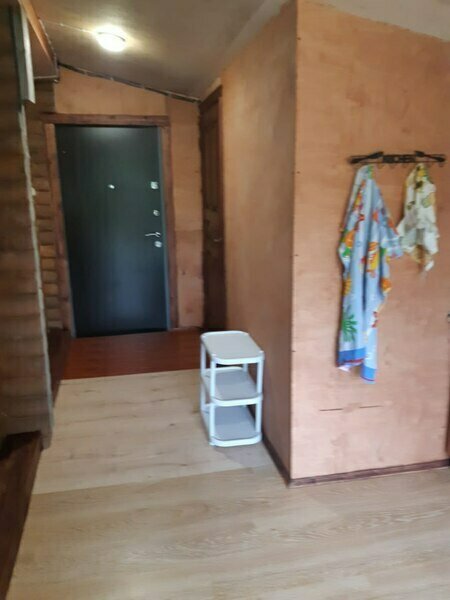 На первом этаже: спальня с двухместной кроватью, туалет, душевая кабина, гостиная с кухонным уголком, телевизор, холодильник, отопление: печное, и электрическое тёплый пол. На втором этаже три спальни с одноместными кроватями и туалет.