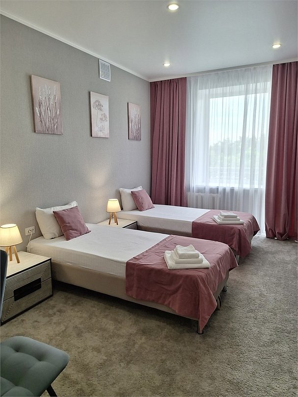 Номера категории "Стандарт" с двумя раздельными кроватями - просторные и уютные двухместные номера с кондиционером и всем необходимым для комфортного проживания. Вид с балкона на реку.Услуги и удобства