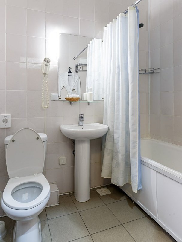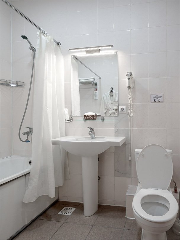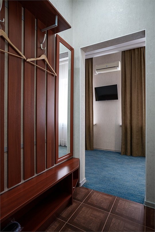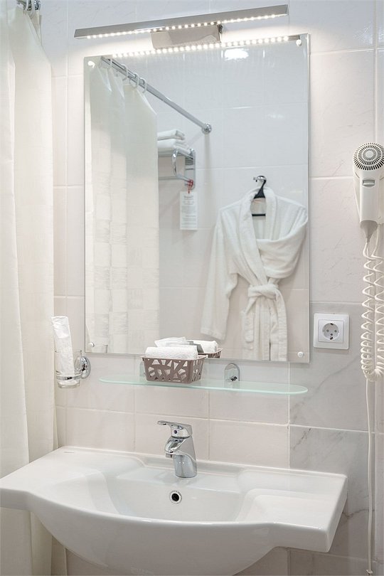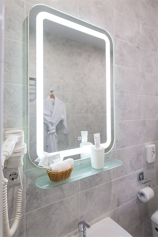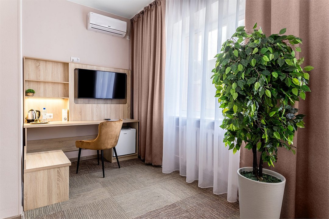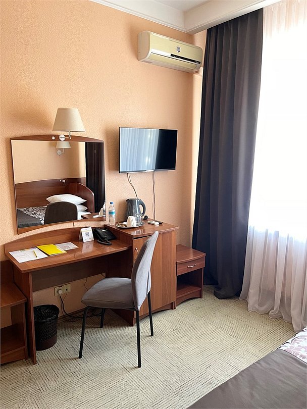 телевизор, Wi-Fi, кондиционер, фен, электронные замки, ванна или душевая кабина, халаты, тапочки, две односпальные или большая двуспальная кровать, стулья, шкаф для одежды, зеркало, вид на город, вид во двор, внутренний телефон, мини-холодильник, гостиничная парфюмерия, без питомцевВ гостиничном номере