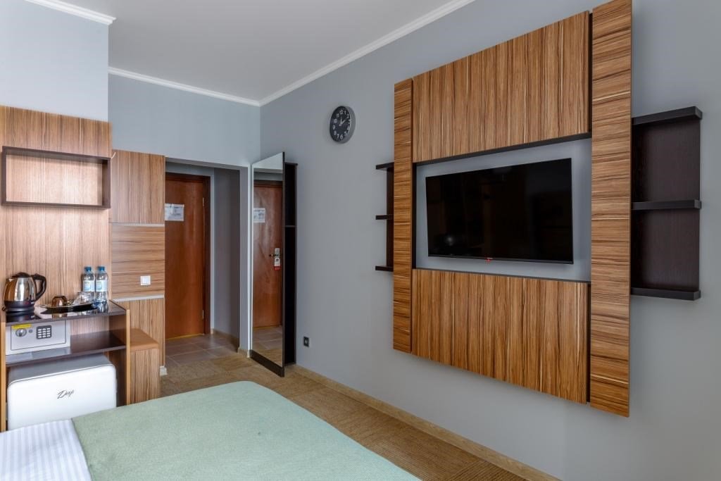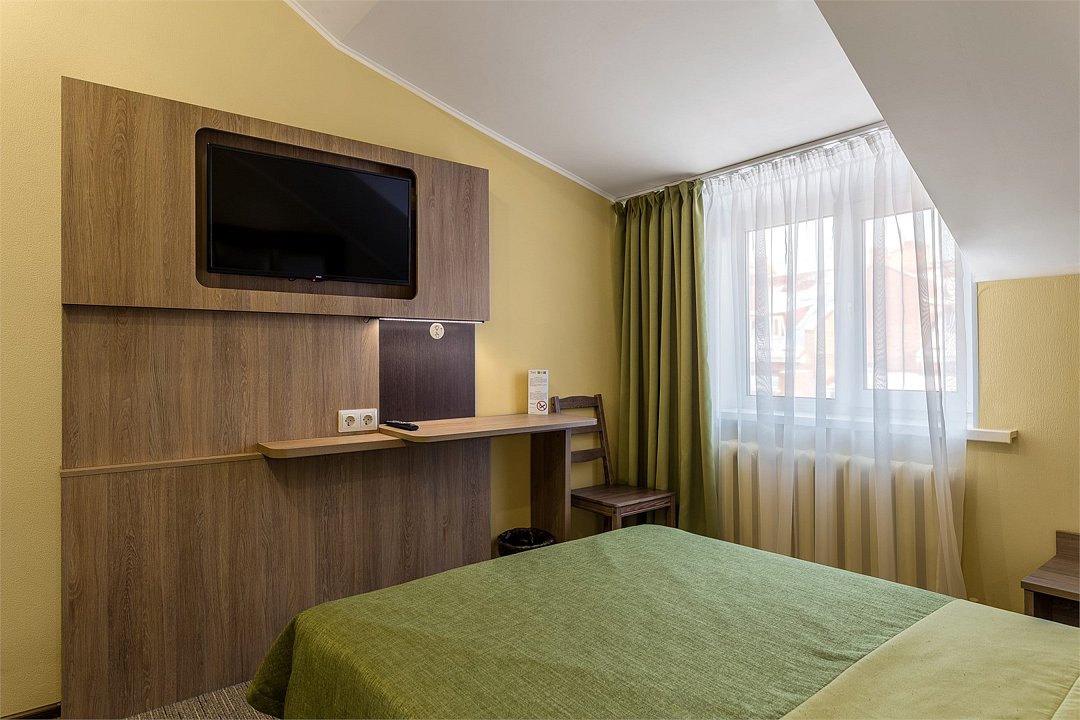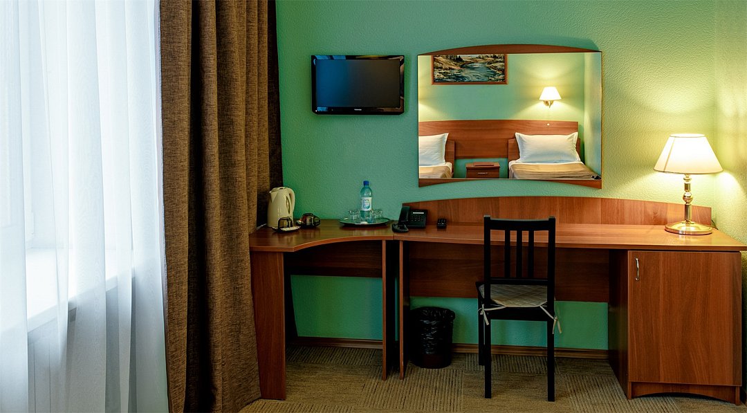 телевизор, Wi-Fi, душевая кабина, односпальная кровать, шкаф для одежды, письменный стол, багажная тумба, зеркало, вид на город, кулер на этаже, стул, внутренний телефон, мини-холодильник, без питомцевВ гостиничном номере