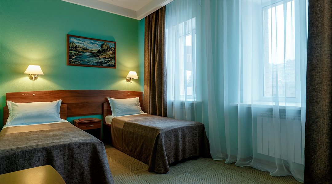 Wi-Fi, телефон, холодильник, кондиционер, светильник, фен, электронные замки, ванна или душевая кабина, санузел, водонагреватель, халаты, банные полотенца, тапочки, две односпальные кровати, шкаф для одежды, вешалки, зеркало, свежая пресса, чайный набор, обслуживание номеров, сейф, чайник, унитаз, раковина, питьевая вода, отопление, вид на город, кулер на этаже, вид во двор, стул, стол, туалетные средства, туалет, цифровое тв, мини-холодильник, гостиничная парфюмерия, без питомцевВ гостиничном номере