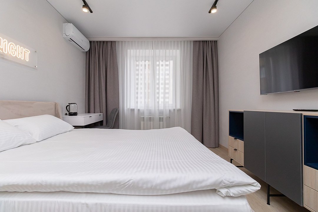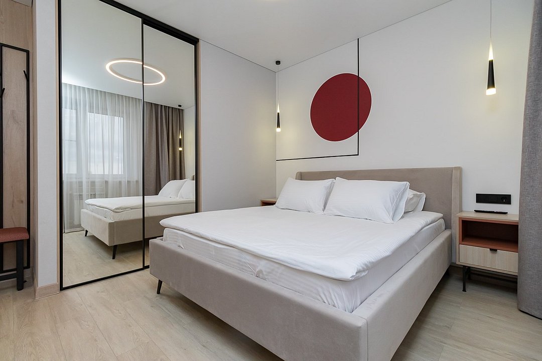 интерактивное телевидение, Wi-Fi, интернет, холодильник, кондиционер, светильник, фен, система безопасности, электронные замки, плита для приготовления пищи, микроволновая печь, утюг, душевая кабина, банные принадлежности, банные полотенца, тапочки, гигиенические средства, балкон, двуспальная кровать, гладильная доска, ортопедический матрас, тумбы, стулья, шкаф для одежды, вешалки, обеденный стол, мебельный гарнитур, кухня, набор посуды, чайник, унитаз, раковина, отопление, вид на город, кухонная посуда, кухонная утварь, столовые приборы, туалетные средства, туалет, сушилка для белья, цифровое тв, телевизор с плоским экраном, москитная сетка, гостиничная парфюмерия, телевизор со Smart TV, номер для некурящих, рабочий стол, гигиенический душ, морозильная камера, уборка номера, шапочка для душа, мыло, затемняющая штора, зеркало в полный рост, онлайн-регистрация, дождевой и ручной душВ апартаментах