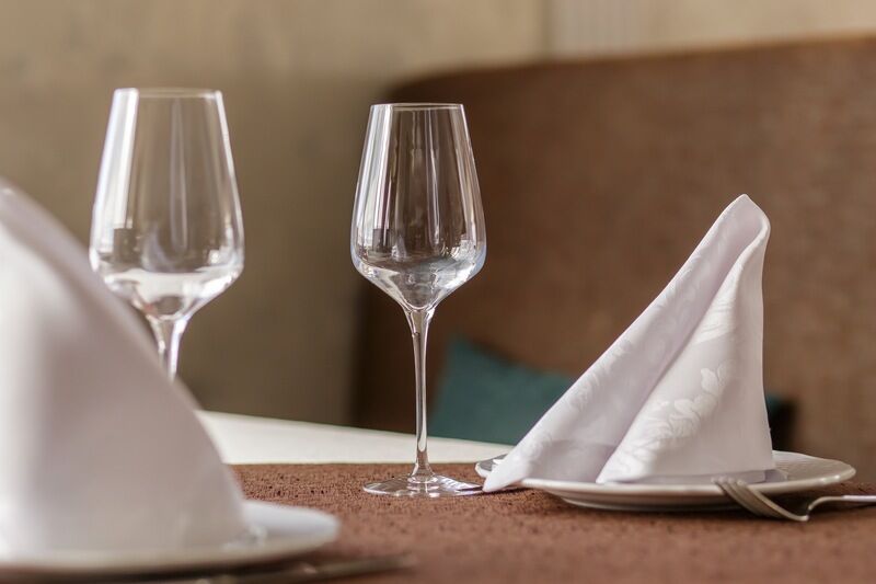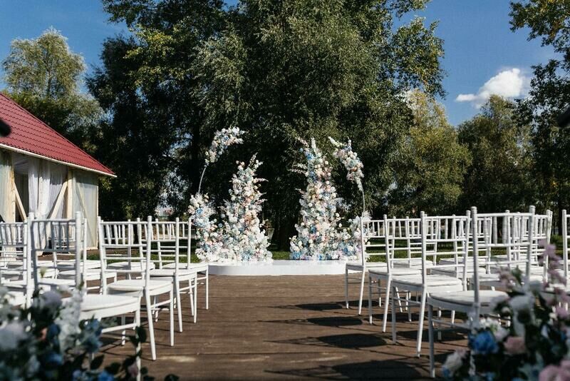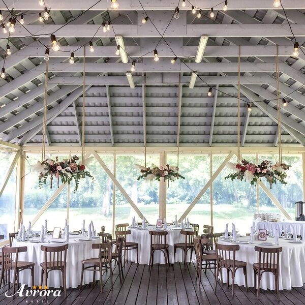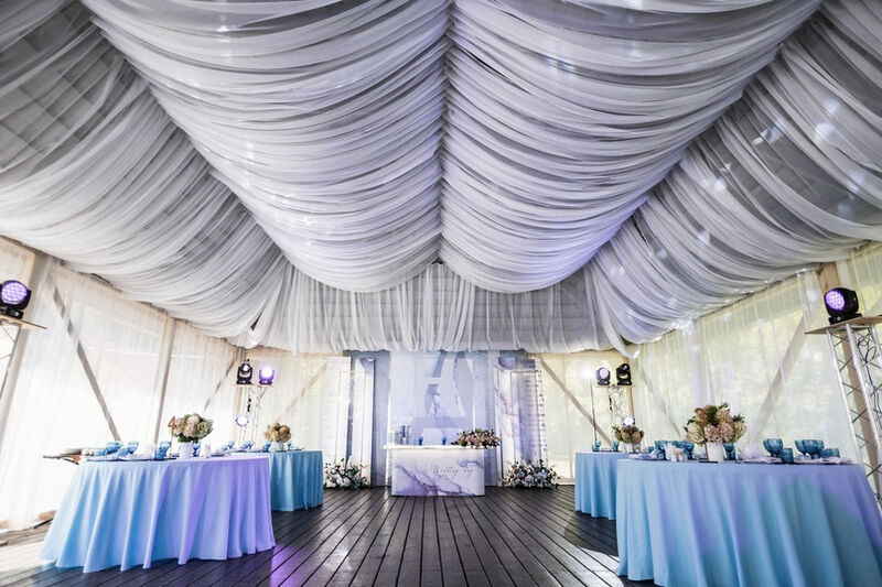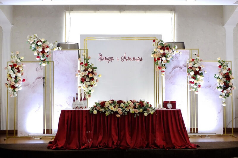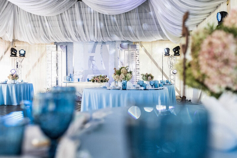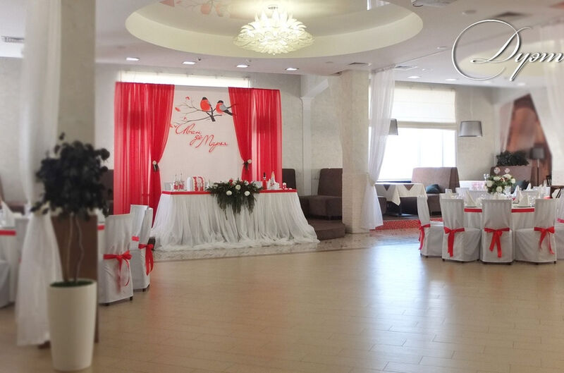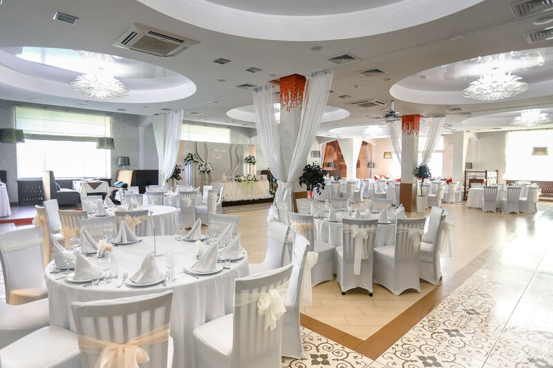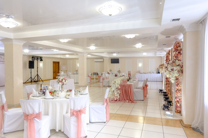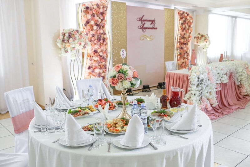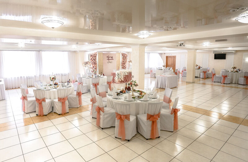 Удобные стулья и столы с текстилем, сервировка — это то, что обязательно должно быть в банкетном зале. Интересная подсветка стола молодоженов и фотозоны сделает праздник уникальным, роскошным и ярким. При выборе зала обратите внимание не только на количество посадочных мест, но и на общую площадь. В маленьком зале с большим количеством столов будет гостям некомфортно.