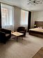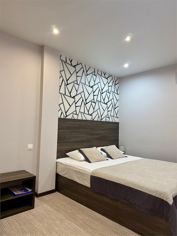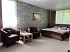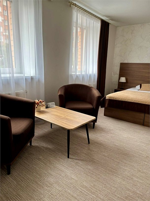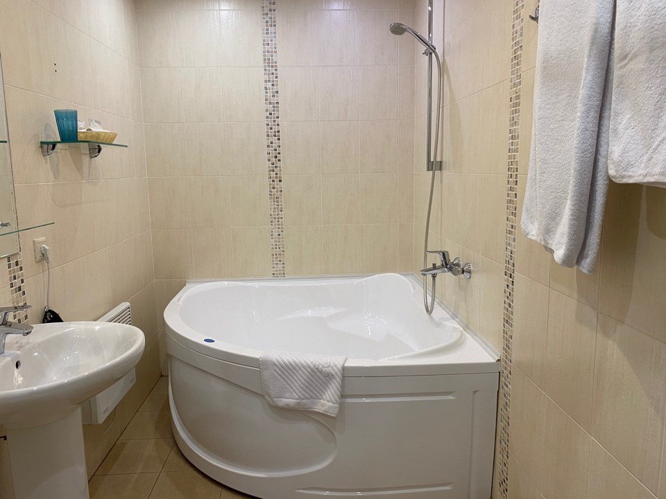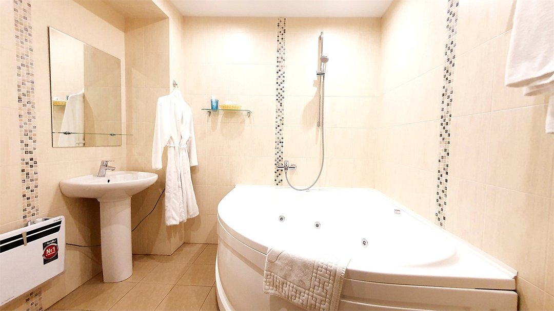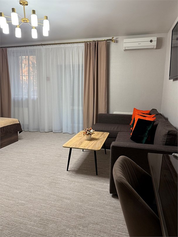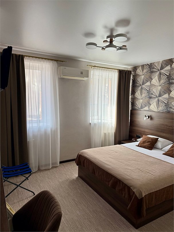 Полулюкс комфортЭлегантный просторный номер повышенной комфортности в теплых золотисто-бежевых тонах, оборудованный кроватью размера 180*200 "king-size" с ортопедическим матрацем, мягким уголком с уютным угловым диваном. Просторная ванная комната оснащена джакузи, туалетными принадлежностями, феном. Окна выходят во внутренний двор – ничто не помешает вам насладиться тишиной и покоем. Номер оснащен кондиционером, холодильником, чайником, телевизором с плоским экраном, WI-FI. Гостям на время пребывания предоставляются махровые халаты и тапочки.