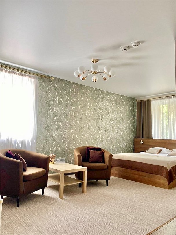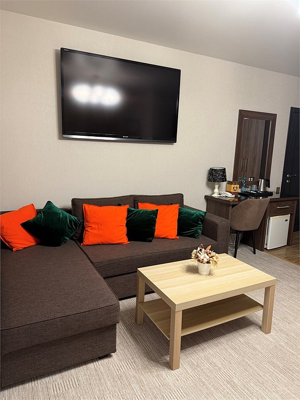 Номера категории «полулюкс» оборудованы 1 широкой двуспальной или 2 односпальными кроватями с ортопедическими матрасами, прикроватными тумбочками, светильниками, столом, стулом, двумя креслами и журнальным столиком. Просторная ванная комната европейского стандарта оснащена угловой ванной, туалетными принадлежностями, феном. В номерах имеются кондиционер, холодильник, чайник, телевизор с плоским экраном, WI-FI. Гостям на время пребывания предоставляются махровые халаты и тапочки.Услуги и удобства