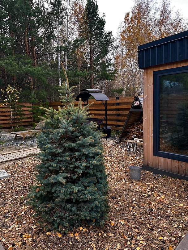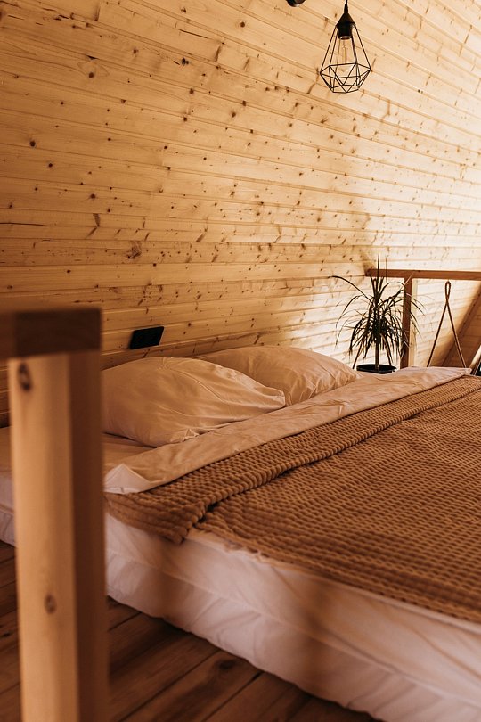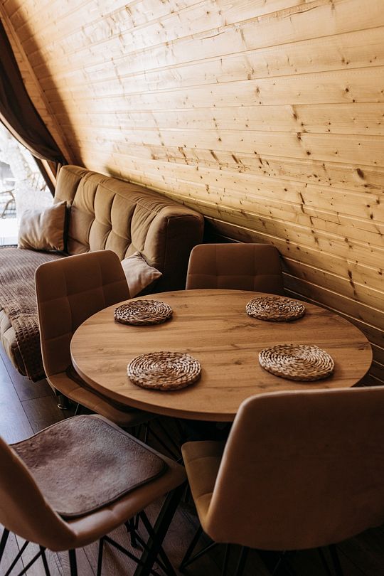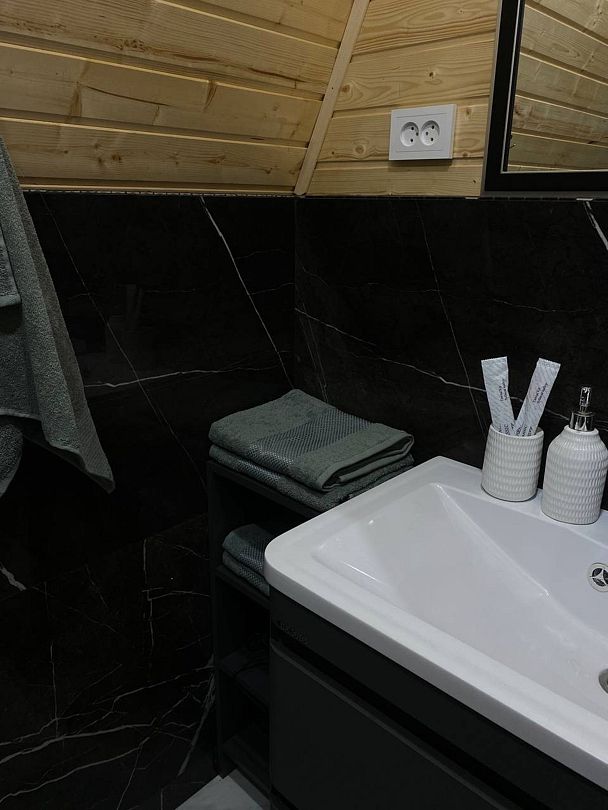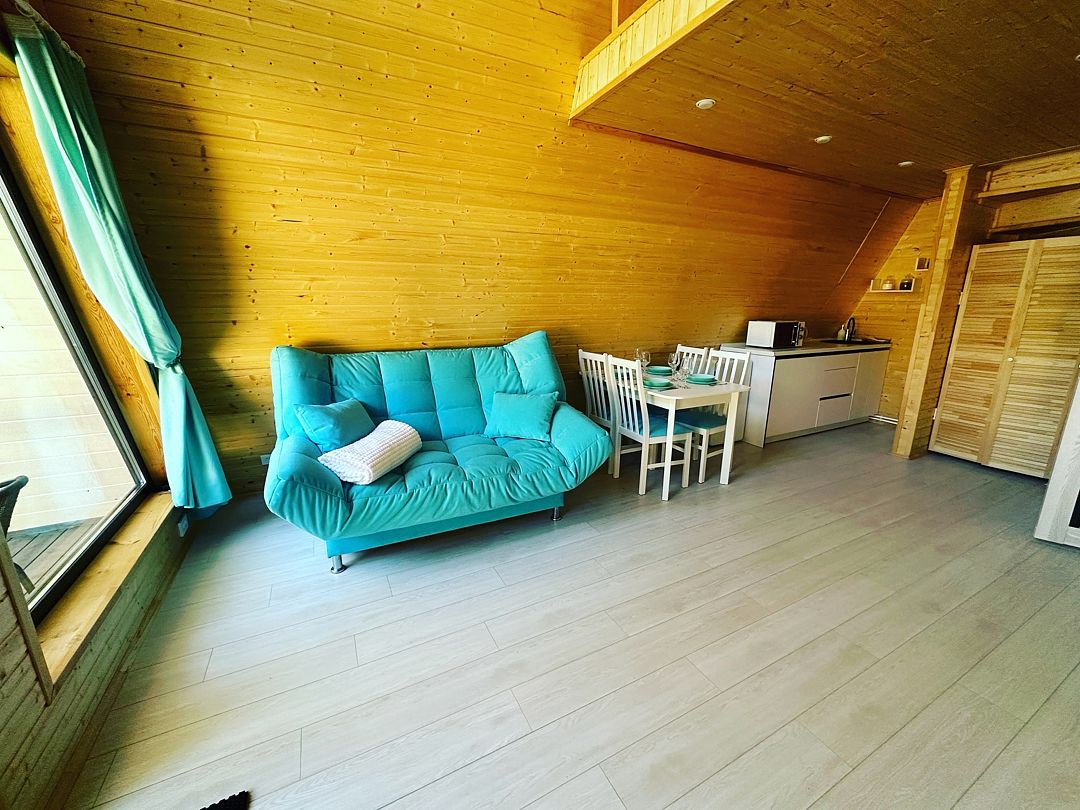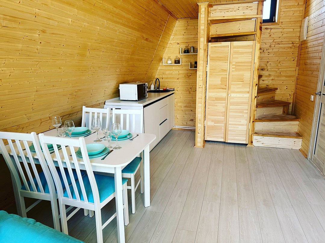К вашим услугам два двухэтажных дома с панорамными окнами и террасой. На первом этаже расположены просторная кухня-гостиная и санузел, а на втором — уютная спальня. Кухня оснащена всем необходимым: холодильником, микроволновой печью, электрическим чайником и посудой на шесть персон. В спальне вас ждет большой эргономичный матрас и качественное постельное белье, обеспечивающие комфортный сон. В санузле есть душевая кабина, унитаз, фен, а также предоставляются полотенца, шампунь, гель для душа и мыло для рук.